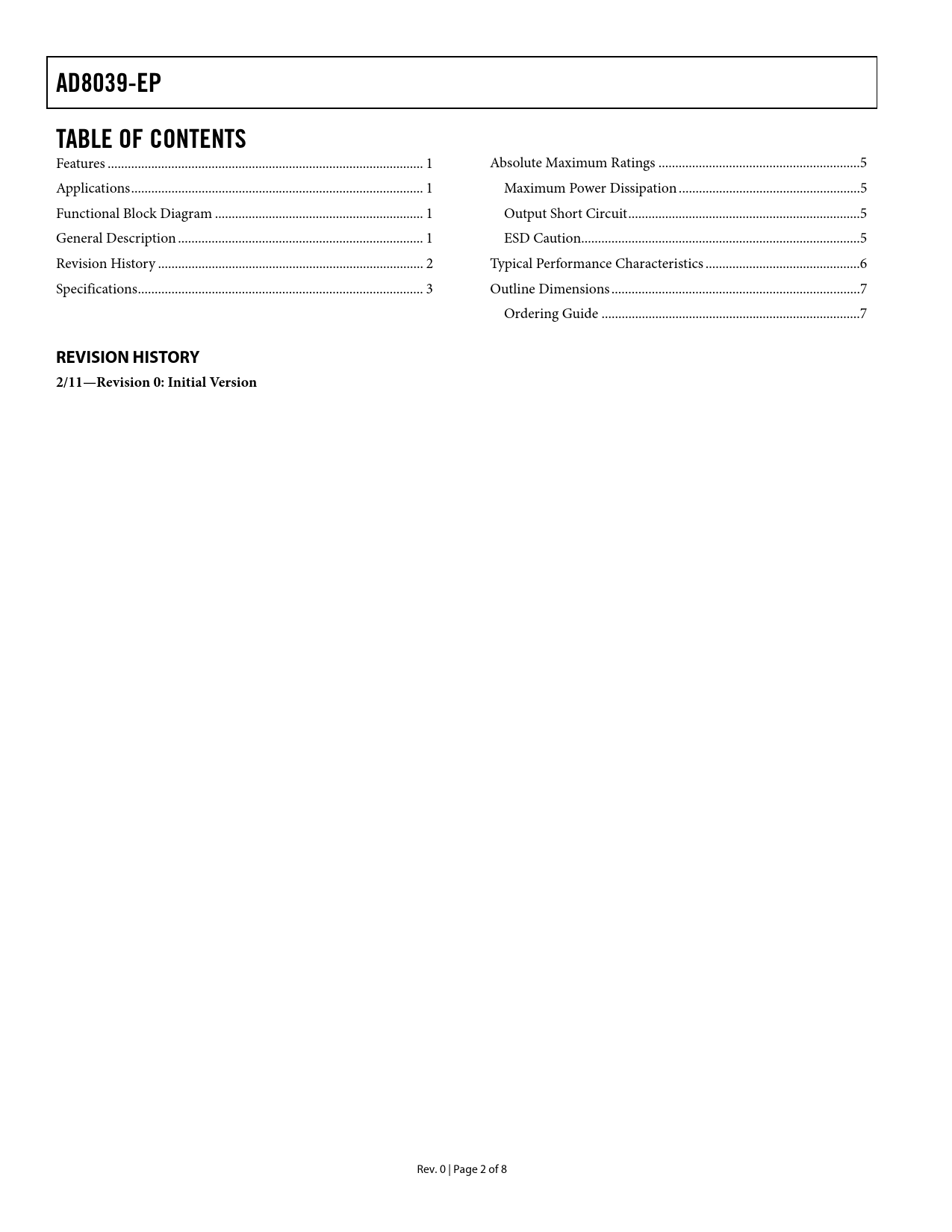 Páginas / Página8 / 2 — AD8039-EP. TABLE OF CONTENTS. REVISION HISTORY. 2/11—Revision 0: Initial …