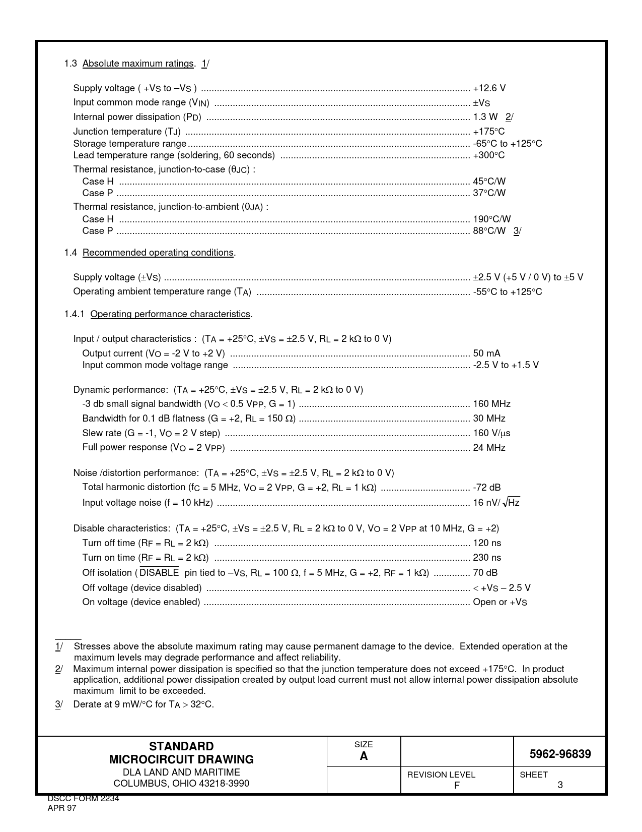 1.3 Absolute maximum ratings. 1/ Supply voltage ( +VS to –VS ) .. +12.6 V Input common mode range (VIN) ... VS Internal power dissipation (PD) .. 1.3 W 2/ Junction temperature (TJ) .. +175C Storage temperature range ... -65C to +125C Lead temperature range (soldering, 60 seconds) .. +300C Thermal resistance, junction-to-case (JC) : Case H ... 45C/W Case P .. 37C/W Thermal resistance, junction-to-ambient (JA) : Case H ... 190C/W Case P .. 88C/W 3/ 1.4 Recommended operating conditions. Supply voltage (VS) .. 2.5 V (+5 V / 0 V) to 5 V Operating ambient temperature range (TA) ... -55C to +125C 1.4.1 Operating performance characteristics. Input / output characteristics : (TA = +25C, VS = 2.5 V, RL = 2 k to 0 V) Output current (VO = -2 V to +2 V) ... 50 mA Input common mode voltage range .. -2.5 V to +1.5 V Dynamic performance: (TA = +25C, VS = 2.5 V, RL = 2 k to 0 V) -3 db small signal bandwidth (VO 0.5 VPP, G = 1) ... 160 MHz Bandwidth for 0.1 dB flatness (G = +2, RL = 150 ) ... 30 MHz Slew rate (G = -1, VO = 2 V step) ... 160 V/s Full power response (VO = 2 VPP) ... 24 MHz Noise /distortion performance: (TA = +25C, VS = 2.5 V, RL = 2 k to 0 V) Total harmonic distortion (fC = 5 MHz, VO = 2 VPP, G = +2, RL = 1 k) .. -72 dB Input voltage noise (f = 10 kHz) .. 16 nV/ Hz Disable characteristics: (TA = +25C, VS = 2.5 V, RL = 2 k to 0 V, VO = 2 VPP at 10 MHz, G = +2) Turn off time (RF = RL = 2 k) ... 120 ns Turn on time (RF = RL = 2 k) ... 230 ns Off isolation ( DISABLE pin tied to –VS, RL = 100 , f = 5 MHz, G = +2, RF = 1 k) .. 70 dB Off voltage (device disabled) .. +VS – 2.5 V On voltage (device enabled) ... Open or +VS _____ 1/ Stresses above the absolute maximum rating may cause permanent damage to the device. Extended operation at the maximum levels may degrade performance and affect reliability. 2/ Maximum internal power dissipation is specified so that the junction temperature does not exceed +175C. In product application, additional power dissipation created by output load current must not allow internal power dissipation absolute maximum limit to be exceeded. 3/ Derate at 9 mW/C for TA 32C. STANDARD SIZE 5962-96839MICROCIRCUIT DRAWINGA DLA LAND AND MARITIME REVISION LEVEL SHEET COLUMBUS, OHIO 43218-3990 F 3 DSCC FORM 2234 APR 97