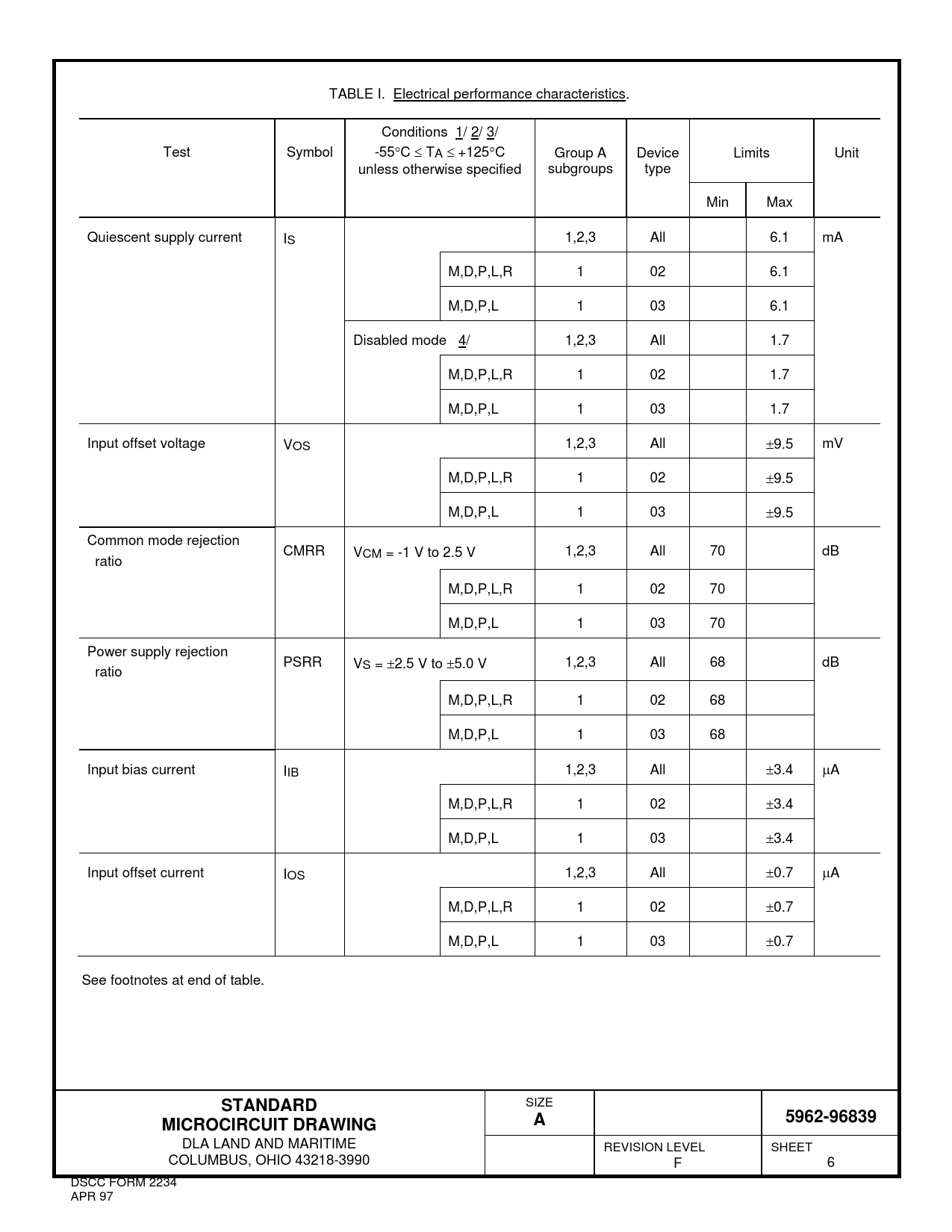 TABLE I. Electrical performance characteristics. Conditions 1/ 2/ 3/ Test Symbol -55C TA +125C Group A Device Limits Unit unless otherwise specified subgroups type Min Max Quiescent supply current IS 1,2,3 All 6.1 mA M,D,P,L,R 1 02 6.1 M,D,P,L 1 03 6.1 Disabled mode 4/ 1,2,3 All 1.7 M,D,P,L,R 1 02 1.7 M,D,P,L 1 03 1.7 Input offset voltage VOS 1,2,3 All 9.5 mV M,D,P,L,R 1 02 9.5 M,D,P,L 1 03 9.5 Common mode rejection CMRR VCM = -1 V to 2.5 V 1,2,3 All 70 dB ratio M,D,P,L,R 1 02 70 M,D,P,L 1 03 70 Power supply rejection PSRR VS = 2.5 V to 5.0 V 1,2,3 All 68 dB ratio M,D,P,L,R 1 02 68 M,D,P,L 1 03 68 Input bias current IIB 1,2,3 All 3.4 A M,D,P,L,R 1 02 3.4 M,D,P,L 1 03 3.4 Input offset current IOS 1,2,3 All 0.7 A M,D,P,L,R 1 02 0.7 M,D,P,L 1 03 0.7 See footnotes at end of table. STANDARD SIZE 5962-96839MICROCIRCUIT DRAWINGA DLA LAND AND MARITIME REVISION LEVEL SHEET COLUMBUS, OHIO 43218-3990 F 6 DSCC FORM 2234 APR 97