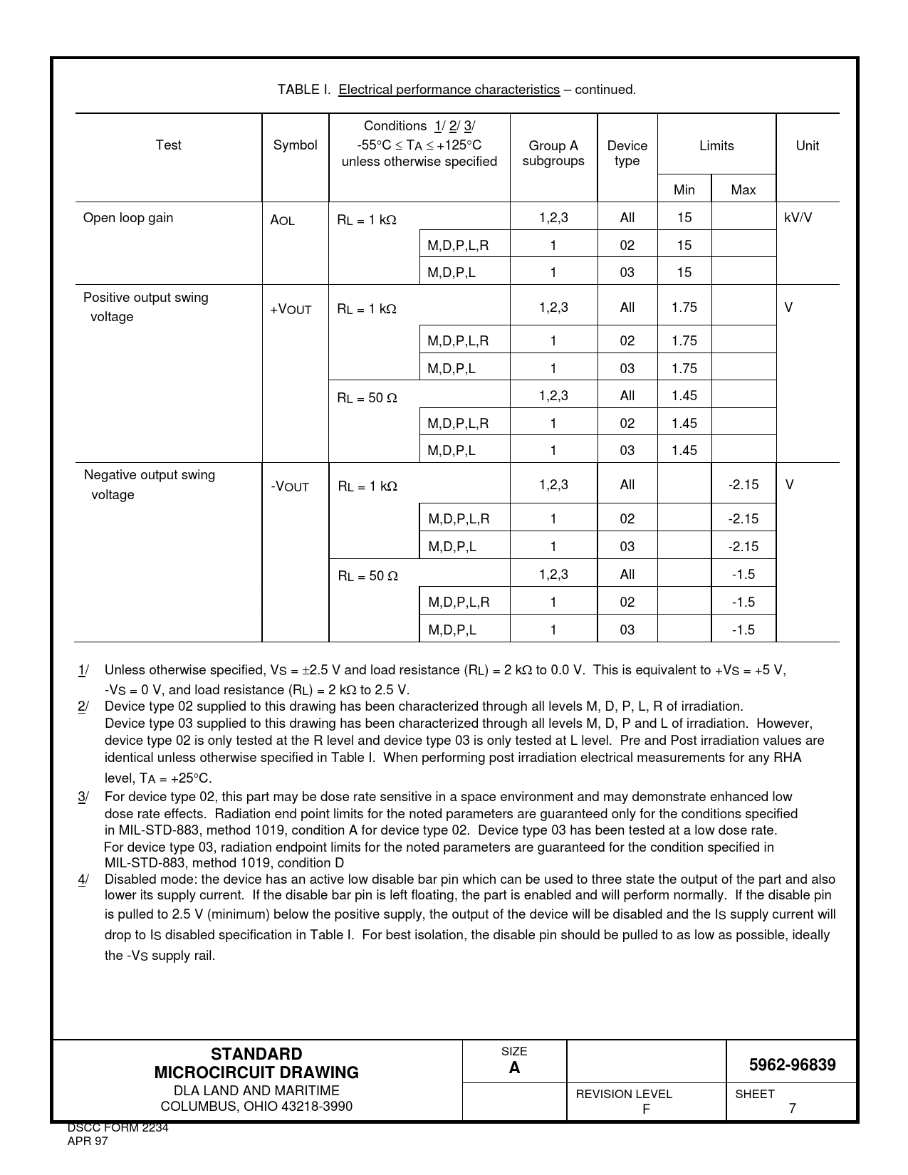 TABLE I. Electrical performance characteristics – continued. Conditions 1/ 2/ 3/ Test Symbol -55C TA +125C Group A Device Limits Unit unless otherwise specified subgroups type Min Max Open loop gain AOL RL = 1 k 1,2,3 All 15 kV/V M,D,P,L,R 1 02 15 M,D,P,L 1 03 15 Positive output swing +VOUT RL = 1 k 1,2,3 All 1.75 V voltage M,D,P,L,R 1 02 1.75 M,D,P,L 1 03 1.75 RL = 50 1,2,3 All 1.45 M,D,P,L,R 1 02 1.45 M,D,P,L 1 03 1.45 Negative output swing -VOUT RL = 1 k 1,2,3 All -2.15 V voltage M,D,P,L,R 1 02 -2.15 M,D,P,L 1 03 -2.15 RL = 50 1,2,3 All -1.5 M,D,P,L,R 1 02 -1.5 M,D,P,L 1 03 -1.5 1/ Unless otherwise specified, VS = 2.5 V and load resistance (RL) = 2 k to 0.0 V. This is equivalent to +VS = +5 V, -VS = 0 V, and load resistance (RL) = 2 k to 2.5 V. 2/ Device type 02 supplied to this drawing has been characterized through all levels M, D, P, L, R of irradiation. Device type 03 supplied to this drawing has been characterized through all levels M, D, P and L of irradiation. However, device type 02 is only tested at the R level and device type 03 is only tested at L level. Pre and Post irradiation values are identical unless otherwise specified in Table I. When performing post irradiation electrical measurements for any RHA level, TA = +25C. 3/ For device type 02, this part may be dose rate sensitive in a space environment and may demonstrate enhanced low dose rate effects. Radiation end point limits for the noted parameters are guaranteed only for the conditions specified in MIL-STD-883, method 1019, condition A for device type 02. Device type 03 has been tested at a low dose rate. For device type 03, radiation endpoint limits for the noted parameters are guaranteed for the condition specified in MIL-STD-883, method 1019, condition D 4/ Disabled mode: the device has an active low disable bar pin which can be used to three state the output of the part and also lower its supply current. If the disable bar pin is left floating, the part is enabled and will perform normally. If the disable pin is pulled to 2.5 V (minimum) below the positive supply, the output of the device will be disabled and the IS supply current will drop to IS disabled specification in Table I. For best isolation, the disable pin should be pulled to as low as possible, ideally the -VS supply rail. STANDARD SIZE 5962-96839MICROCIRCUIT DRAWINGA DLA LAND AND MARITIME REVISION LEVEL SHEET COLUMBUS, OHIO 43218-3990 F 7 DSCC FORM 2234 APR 97