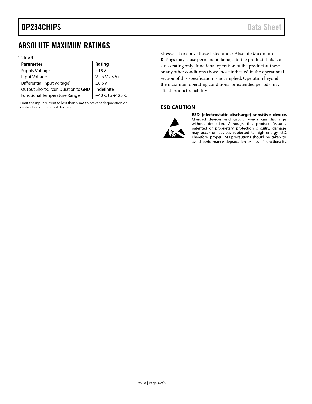 OP284CHIPS Data Sheet ABSOLUTE MAXIMUM RATINGS Table 3 Parameter Rating ESD CAUTION