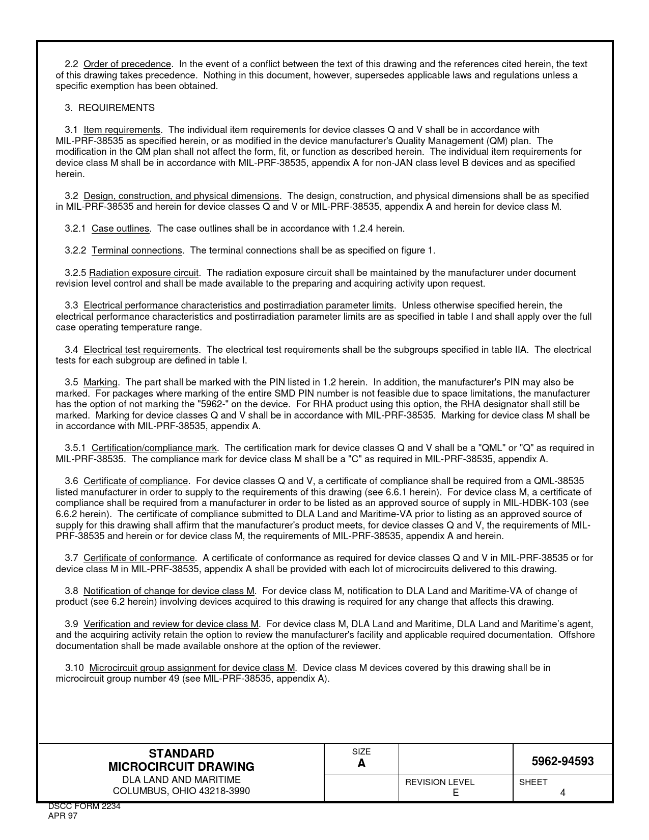 2.2 Order of precedence. In the event of a conflict between the text of this drawing and the references cited herein, the text of this drawing takes precedence. Nothing in this document, however, supersedes applicable laws and regulations unless a specific exemption has been obtained. 3. REQUIREMENTS 3.1 Item requirements. The individual item requirements for device classes Q and V shall be in accordance with MIL-PRF-38535 as specified herein, or as modified in the device manufacturer's Quality Management (QM) plan. The modification in the QM plan shall not affect the form, fit, or function as described herein. The individual item requirements for device class M shall be in accordance with MIL-PRF-38535, appendix A for non-JAN class level B devices and as specified herein. 3.2 Design, construction, and physical dimensions. The design, construction, and physical dimensions shall be as specified in MIL-PRF-38535 and herein for device classes Q and V or MIL-PRF-38535, appendix A and herein for device class M. 3.2.1 Case outlines. The case outlines shall be in accordance with 1.2.4 herein. 3.2.2 Terminal connections. The terminal connections shall be as specified on figure 1. 3.2.5 Radiation exposure circuit. The radiation exposure circuit shall be maintained by the manufacturer under document revision level control and shall be made available to the preparing and acquiring activity upon request. 3.3 Electrical performance characteristics and postirradiation parameter limits. Unless otherwise specified herein, the electrical performance characteristics and postirradiation parameter limits are as specified in table I and shall apply over the full case operating temperature range. 3.4 Electrical test requirements. The electrical test requirements shall be the subgroups specified in table IIA. The electrical tests for each subgroup are defined in table I. 3.5 Marking. The part shall be marked with the PIN listed in 1.2 herein. In addition, the manufacturer's PIN may also be marked. For packages where marking of the entire SMD PIN number is not feasible due to space limitations, the manufacturer has the option of not marking the "5962-" on the device. For RHA product using this option, the RHA designator shall still be marked. Marking for device classes Q and V shall be in accordance with MIL-PRF-38535. Marking for device class M shall be in accordance with MIL-PRF-38535, appendix A. 3.5.1 Certification/compliance mark. The certification mark for device classes Q and V shall be a "QML" or "Q" as required in MIL-PRF-38535. The compliance mark for device class M shall be a "C" as required in MIL-PRF-38535, appendix A. 3.6 Certificate of compliance. For device classes Q and V, a certificate of compliance shall be required from a QML-38535 listed manufacturer in order to supply to the requirements of this drawing (see 6.6.1 herein). For device class M, a certificate of compliance shall be required from a manufacturer in order to be listed as an approved source of supply in MIL-HDBK-103 (see 6.6.2 herein). The certificate of compliance submitted to DLA Land and Maritime-VA prior to listing as an approved source of supply for this drawing shall affirm that the manufacturer's product meets, for device classes Q and V, the requirements of MIL- PRF-38535 and herein or for device class M, the requirements of MIL-PRF-38535, appendix A and herein. 3.7 Certificate of conformance. A certificate of conformance as required for device classes Q and V in MIL-PRF-38535 or for device class M in MIL-PRF-38535, appendix A shall be provided with each lot of microcircuits delivered to this drawing. 3.8 Notification of change for device class M. For device class M, notification to DLA Land and Maritime-VA of change of product (see 6.2 herein) involving devices acquired to this drawing is required for any change that affects this drawing. 3.9 Verification and review for device class M. For device class M, DLA Land and Maritime, DLA Land and Maritime’s agent, and the acquiring activity retain the option to review the manufacturer's facility and applicable required documentation. Offshore documentation shall be made available onshore at the option of the reviewer. 3.10 Microcircuit group assignment for device class M. Device class M devices covered by this drawing shall be in microcircuit group number 49 (see MIL-PRF-38535, appendix A). STANDARD SIZE 5962-94593MICROCIRCUIT DRAWINGA DLA LAND AND MARITIME REVISION LEVEL SHEET COLUMBUS, OHIO 43218-3990 E 4 DSCC FORM 2234 APR 97 Document Outline DEPARTMENT OF DEFENSE SPECIFICATION DEPARTMENT OF DEFENSE STANDARDS