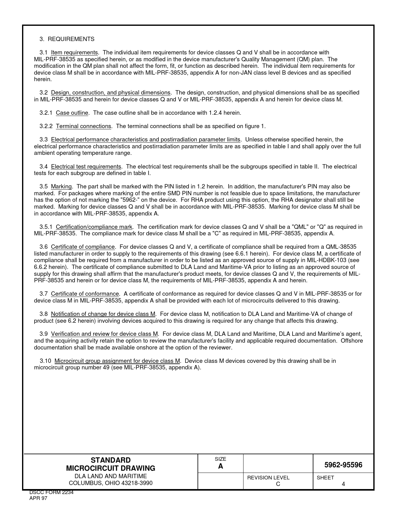 3. REQUIREMENTS 3.1 Item requirements. The individual item requirements for device classes Q and V shall be in accordance with MIL-PRF-38535 as specified herein, or as modified in the device manufacturer's Quality Management (QM) plan. The modification in the QM plan shall not affect the form, fit, or function as described herein. The individual item requirements for device class M shall be in accordance with MIL-PRF-38535, appendix A for non-JAN class level B devices and as specified herein. 3.2 Design, construction, and physical dimensions. The design, construction, and physical dimensions shall be as specified in MIL-PRF-38535 and herein for device classes Q and V or MIL-PRF-38535, appendix A and herein for device class M. 3.2.1 Case outline. The case outline shall be in accordance with 1.2.4 herein. 3.2.2 Terminal connections. The terminal connections shall be as specified on figure 1. 3.3 Electrical performance characteristics and postirradiation parameter limits. Unless otherwise specified herein, the electrical performance characteristics and postirradiation parameter limits are as specified in table I and shall apply over the full ambient operating temperature range. 3.4 Electrical test requirements. The electrical test requirements shall be the subgroups specified in table II. The electrical tests for each subgroup are defined in table I. 3.5 Marking. The part shall be marked with the PIN listed in 1.2 herein. In addition, the manufacturer's PIN may also be marked. For packages where marking of the entire SMD PIN number is not feasible due to space limitations, the manufacturer has the option of not marking the "5962-" on the device. For RHA product using this option, the RHA designator shall still be marked. Marking for device classes Q and V shall be in accordance with MIL-PRF-38535. Marking for device class M shall be in accordance with MIL-PRF-38535, appendix A. 3.5.1 Certification/compliance mark. The certification mark for device classes Q and V shall be a "QML" or "Q" as required in MIL-PRF-38535. The compliance mark for device class M shall be a "C" as required in MIL-PRF-38535, appendix A. 3.6 Certificate of compliance. For device classes Q and V, a certificate of compliance shall be required from a QML-38535 listed manufacturer in order to supply to the requirements of this drawing (see 6.6.1 herein). For device class M, a certificate of compliance shall be required from a manufacturer in order to be listed as an approved source of supply in MIL-HDBK-103 (see 6.6.2 herein). The certificate of compliance submitted to DLA Land and Maritime-VA prior to listing as an approved source of supply for this drawing shall affirm that the manufacturer's product meets, for device classes Q and V, the requirements of MIL- PRF-38535 and herein or for device class M, the requirements of MIL-PRF-38535, appendix A and herein. 3.7 Certificate of conformance. A certificate of conformance as required for device classes Q and V in MIL-PRF-38535 or for device class M in MIL-PRF-38535, appendix A shall be provided with each lot of microcircuits delivered to this drawing. 3.8 Notification of change for device class M. For device class M, notification to DLA Land and Maritime-VA of change of product (see 6.2 herein) involving devices acquired to this drawing is required for any change that affects this drawing. 3.9 Verification and review for device class M. For device class M, DLA Land and Maritime, DLA Land and Maritime’s agent, and the acquiring activity retain the option to review the manufacturer's facility and applicable required documentation. Offshore documentation shall be made available onshore at the option of the reviewer. 3.10 Microcircuit group assignment for device class M. Device class M devices covered by this drawing shall be in microcircuit group number 49 (see MIL-PRF-38535, appendix A). STANDARD SIZE 5962-95596MICROCIRCUIT DRAWINGA DLA LAND AND MARITIME REVISION LEVEL SHEET COLUMBUS, OHIO 43218-3990 C 4 DSCC FORM 2234 APR 97 Document Outline DEPARTMENT OF DEFENSE SPECIFICATION DEPARTMENT OF DEFENSE STANDARDS