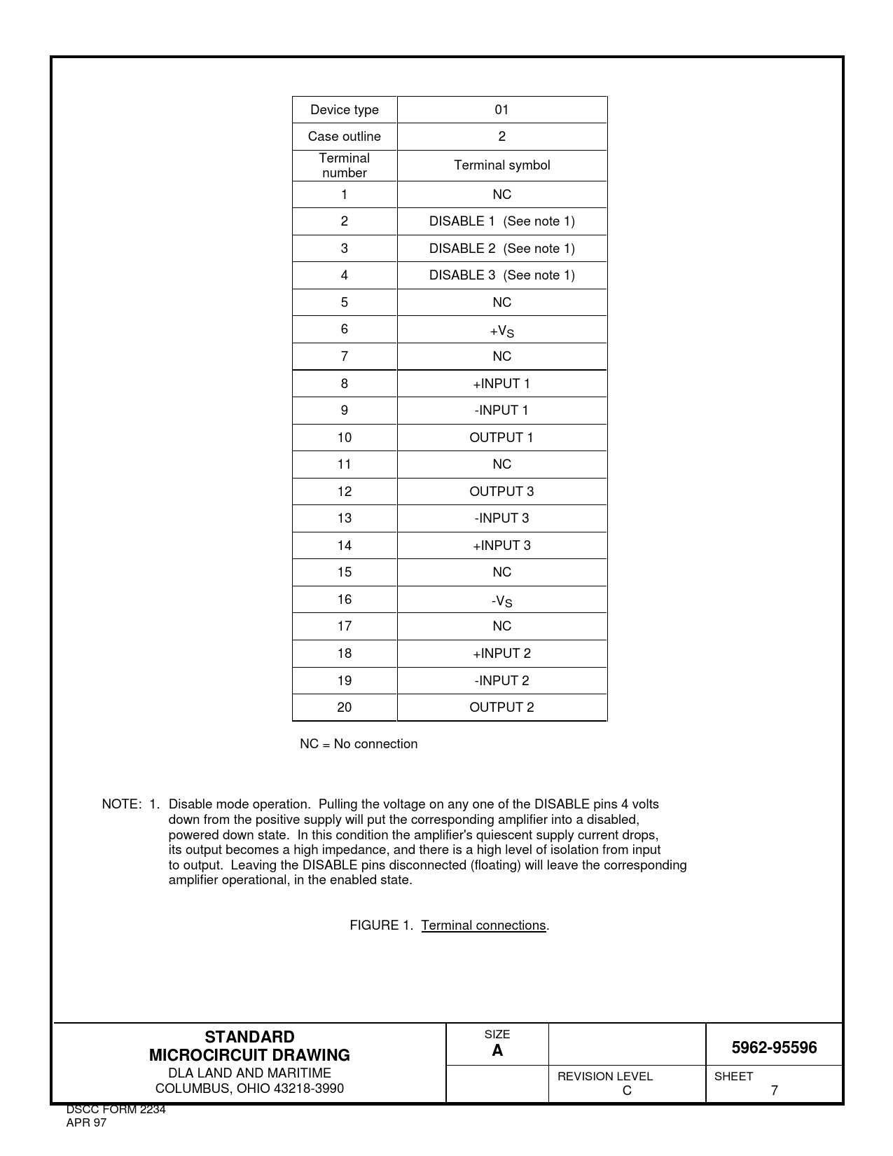 Device type 01 Case outline 2 Terminal Terminal symbol number 1 NC 2 DISABLE 1 (See note 1) 3 DISABLE 2 (See note 1) 4 DISABLE 3 (See note 1) 5 NC 6 +VS 7 NC 8 +INPUT 1 9 -INPUT 1 10 OUTPUT 1 11 NC 12 OUTPUT 3 13 -INPUT 3 14 +INPUT 3 15 NC 16 -VS 17 NC 18 +INPUT 2 19 -INPUT 2 20 OUTPUT 2 NC = No connection NOTE: 1. Disable mode operation. Pulling the voltage on any one of the DISABLE pins 4 volts down from the positive supply will put the corresponding amplifier into a disabled, powered down state. In this condition the amplifier's quiescent supply current drops, its output becomes a high impedance, and there is a high level of isolation from input to output. Leaving the DISABLE pins disconnected (floating) will leave the corresponding amplifier operational, in the enabled state. FIGURE 1. Terminal connections.