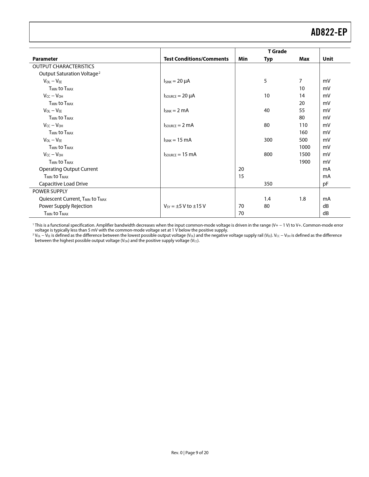 link to page 9 AD822-EPTGradeParameterTest Conditions/CommentsMinTypMaxUnit OUTPUT CHARACTERISTICS Output Saturation Voltage2 VOL − VEE ISINK = 20 μA 5 7 mV TMIN to TMAX 10 mV VCC − VOH ISOURCE = 20 μA 10 14 mV TMIN to TMAX 20 mV VOL − VEE ISINK = 2 mA 40 55 mV TMIN to TMAX 80 mV VCC − VOH ISOURCE = 2 mA 80 110 mV TMIN to TMAX 160 mV VOL − VEE ISINK = 15 mA 300 500 mV TMIN to TMAX 1000 mV VCC − VOH ISOURCE = 15 mA 800 1500 mV TMIN to TMAX 1900 mV Operating Output Current 20 mA TMIN to TMAX 15 mA Capacitive Load Drive 350 pF POWER SUPPLY Quiescent Current, TMIN to TMAX 1.4 1.8 mA Power Supply Rejection VSY = ±5 V to ±15 V 70 80 dB TMIN to TMAX 70 dB 1 This is a functional specification. Amplifier bandwidth decreases when the input common-mode voltage is driven in the range (V+ − 1 V) to V+. Common-mode error voltage is typically less than 5 mV with the common-mode voltage set at 1 V below the positive supply. 2 VOL − VEE is defined as the difference between the lowest possible output voltage (VOL) and the negative voltage supply rail (VEE). VCC − VOH is defined as the difference between the highest possible output voltage (VOH) and the positive supply voltage (VCC). Rev. 0 | Page 9 of 20 Document Outline FEATURES ENHANCED PRODUCT FEATURES APPLICATIONS CONNECTION DIAGRAM GENERAL DESCRIPTION TABLE OF CONTENTS REVISION HISTORY SPECIFICATIONS ABSOLUTE MAXIMUM RATINGS THERMAL RESISTANCE ESD CAUTION TYPICAL PERFORMANCE CHARACTERISTICS OUTLINE DIMENSIONS ORDERING GUIDE