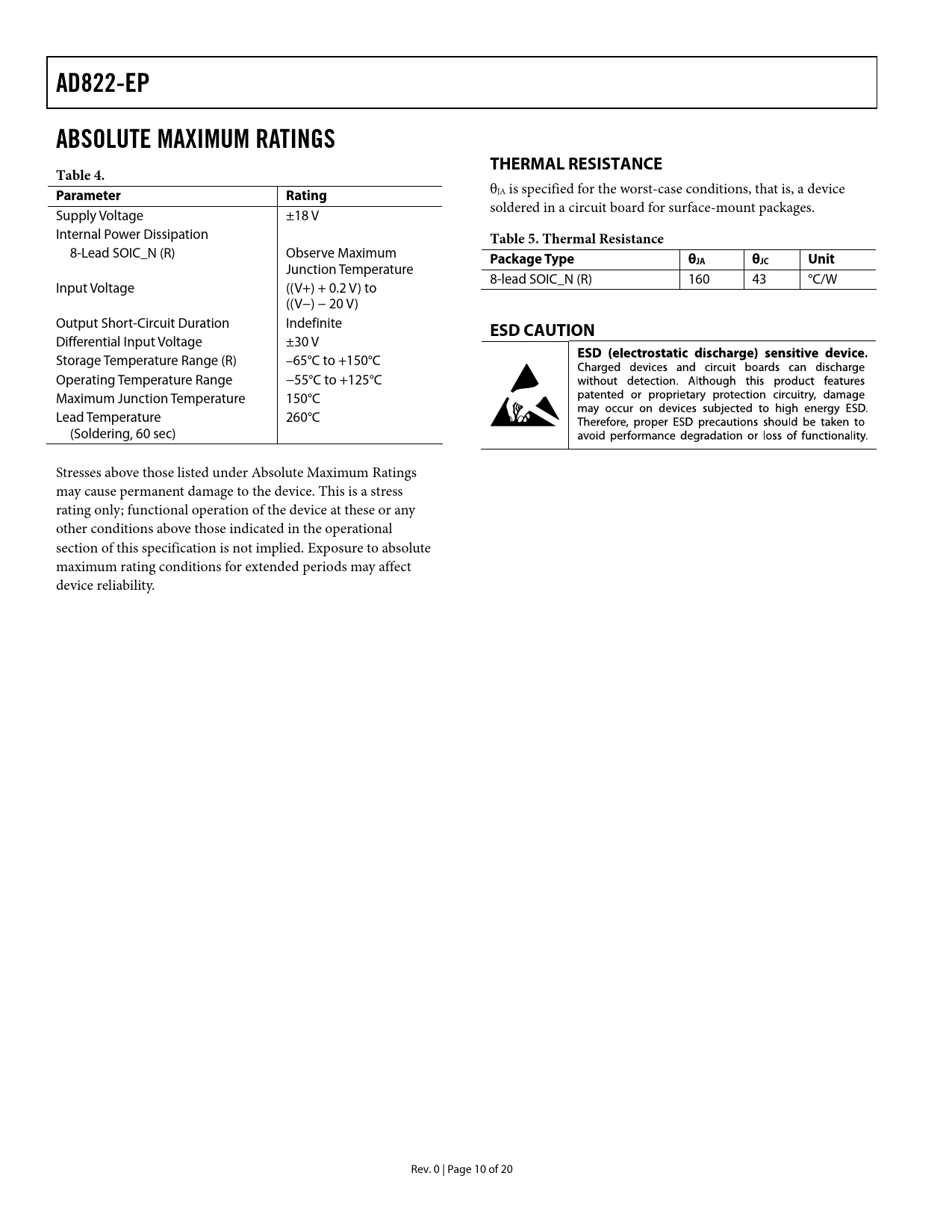 Páginas / Página20 / 10 — AD822-EP. ABSOLUTE MAXIMUM RATINGS. THERMAL RESISTANCE. Table 4. …