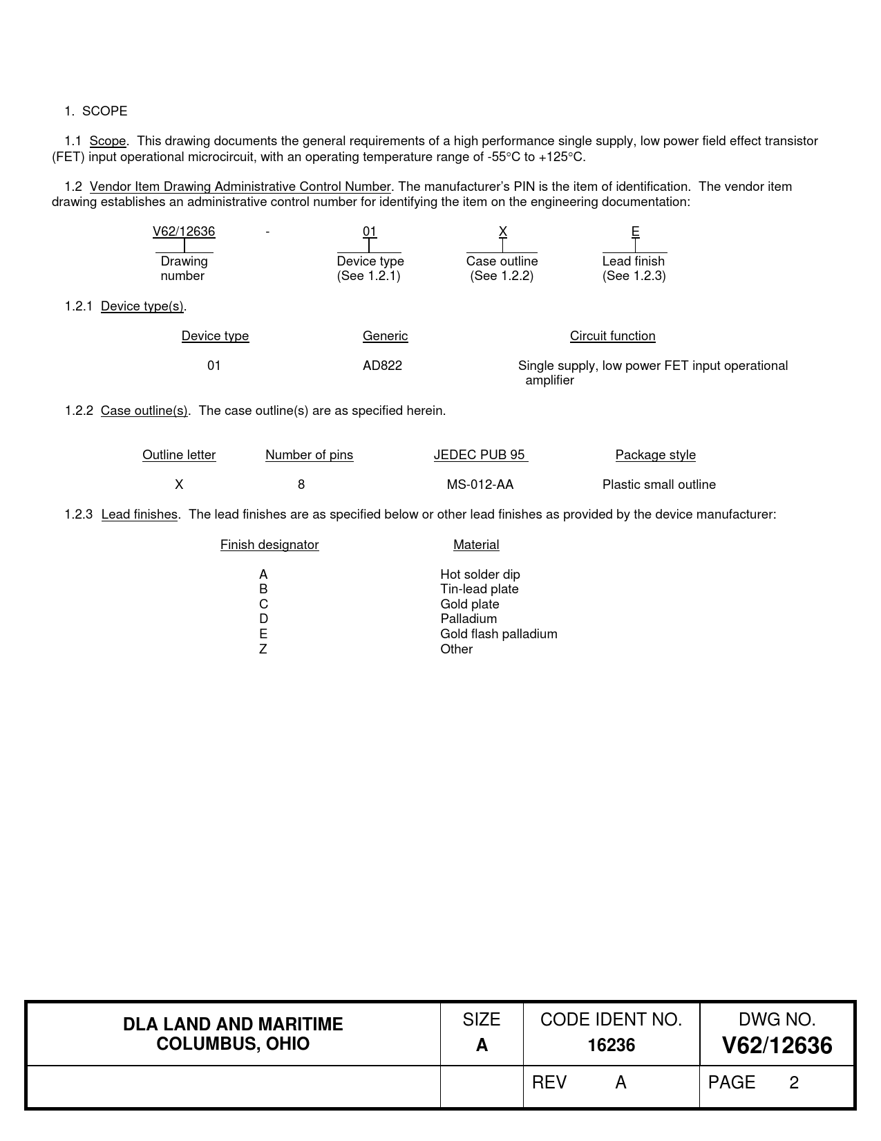 1. SCOPE 1.1 Scope. This drawing documents the general requirements of a high performance single supply, low power field effect transistor (FET) input operational microcircuit, with an operating temperature range of -55C to +125C. 1.2 Vendor Item Drawing Administrative Control Number. The manufacturer’s PIN is the item of identification. The vendor item drawing establishes an administrative control number for identifying the item on the engineering documentation: V62/12636 - 01 X E Drawing Device type Case outline Lead finish number (See 1.2.1) (See 1.2.2) (See 1.2.3) 1.2.1 Device type(s). Device type Generic Circuit function 01 AD822 Single supply, low power FET input operational amplifier 1.2.2 Case outline(s). The case outline(s) are as specified herein. Outline letter Number of pins JEDEC PUB 95 Package style X 8 MS-012-AA Plastic small outline 1.2.3 Lead finishes. The lead finishes are as specified below or other lead finishes as provided by the device manufacturer: Finish designator Material A Hot solder dip B Tin-lead plate C Gold plate D Palladium E Gold flash palladium Z Other DLA LAND AND MARITIME SIZE CODE IDENT NO. DWG NO. COLUMBUS, OHIOA16236V62/12636 REV A PAGE 2