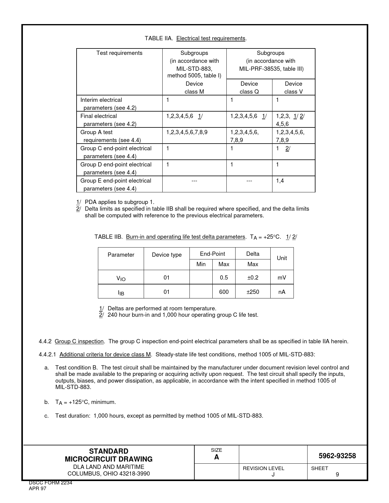 TABLE IIA. Electrical test requirements. Test requirements Subgroups Subgroups (in accordance with (in accordance with MIL-STD-883, MIL-PRF-38535, table III) method 5005, table I) Device Device Device class M class Q class V Interim electrical 1 1 1 parameters (see 4.2) Final electrical 1,2,3,4,5,6 1/ 1,2,3,4,5,6 1/ 1,2,3, 1/ 2/ parameters (see 4.2) 4,5,6 Group A test 1,2,3,4,5,6,7,8,9 1,2,3,4,5,6, 1,2,3,4,5,6, requirements (see 4.4) 7,8,9 7,8,9 Group C end-point electrical 1 1 1 2/ parameters (see 4.4) Group D end-point electrical 1 1 1 parameters (see 4.4) Group E end-point electrical --- --- 1,4 parameters (see 4.4) 1/ PDA applies to subgroup 1. 2/ Delta limits as specified in table IIB shall be required where specified, and the delta limits shall be computed with reference to the previous electrical parameters. TABLE IIB. Burn-in and operating life test delta parameters. TA = +25C. 1/ 2/ Parameter Device type End-Point Delta Unit Min Max Max VIO 01 0.5 ±0.2 mV IIB 01 600 ±250 nA 1/ Deltas are performed at room temperature. 2/ 240 hour burn-in and 1,000 hour operating group C life test. 4.4.2 Group C inspection. The group C inspection end-point electrical parameters shall be as specified in table IIA herein. 4.4.2.1 Additional criteria for device class M. Steady-state life test conditions, method 1005 of MIL-STD-883: a. Test condition B. The test circuit shall be maintained by the manufacturer under document revision level control and shall be made available to the preparing or acquiring activity upon request. The test circuit shall specify the inputs, outputs, biases, and power dissipation, as applicable, in accordance with the intent specified in method 1005 of MIL-STD-883. b. TA = +125C, minimum. c. Test duration: 1,000 hours, except as permitted by method 1005 of MIL-STD-883.