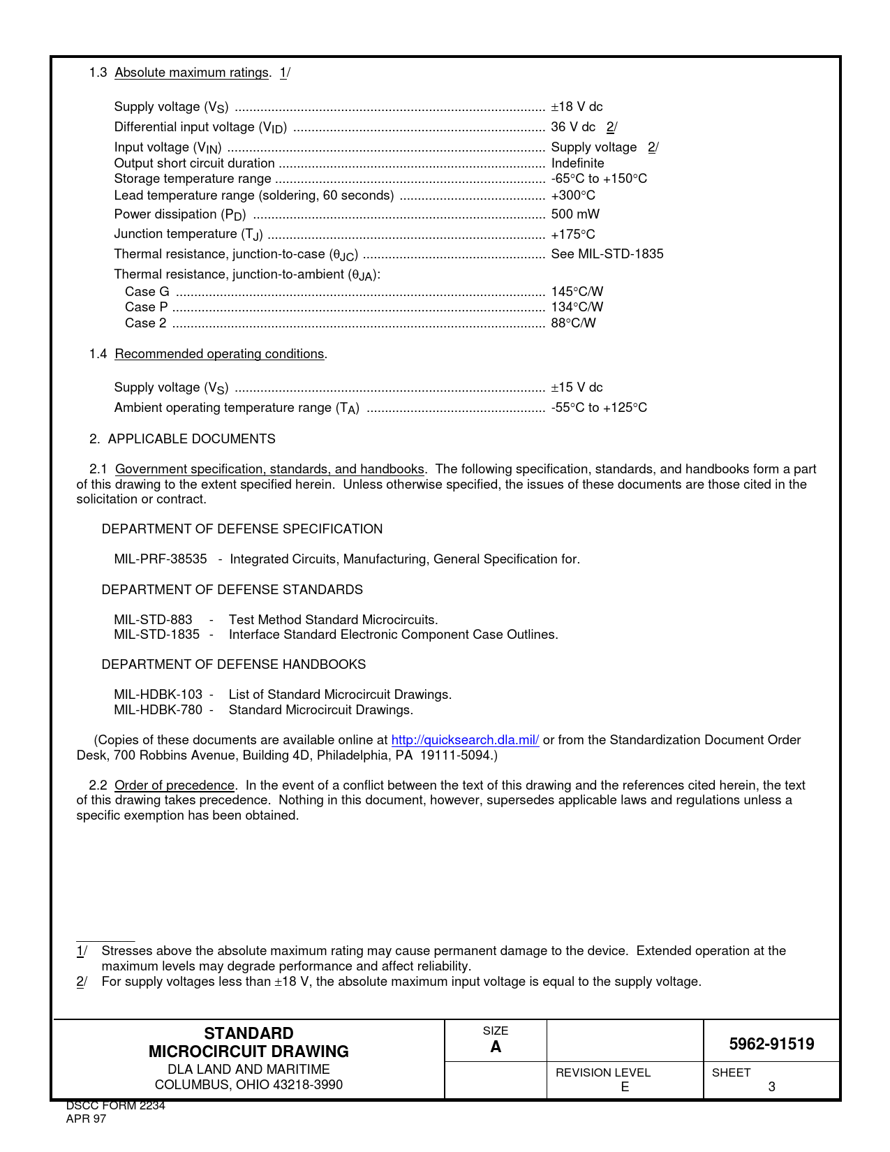 1.3 Absolute maximum ratings. 1/ Supply voltage (VS) ... ±18 V dc Differential input voltage (VID) ... 36 V dc 2/ Input voltage (VIN) ... Supply voltage 2/ Output short circuit duration ... Indefinite Storage temperature range .. -65°C to +150°C Lead temperature range (soldering, 60 seconds) .. +300°C Power dissipation (PD) .. 500 mW Junction temperature (TJ) .. +175°C Thermal resistance, junction-to-case (θJC) .. See MIL-STD-1835 Thermal resistance, junction-to-ambient (θJA): Case G ... 145°C/W Case P .. 134°C/W Case 2 .. 88°C/W 1.4 Recommended operating conditions. Supply voltage (VS) ... ±15 V dc Ambient operating temperature range (TA) ... -55°C to +125°C 2. APPLICABLE DOCUMENTS 2.1 Government specification, standards, and handbooks. The following specification, standards, and handbooks form a part of this drawing to the extent specified herein. Unless otherwise specified, the issues of these documents are those cited in the solicitation or contract. DEPARTMENT OF DEFENSE SPECIFICATION MIL-PRF-38535 - Integrated Circuits, Manufacturing, General Specification for. DEPARTMENT OF DEFENSE STANDARDS MIL-STD-883 - Test Method Standard Microcircuits. MIL-STD-1835 - Interface Standard Electronic Component Case Outlines. DEPARTMENT OF DEFENSE HANDBOOKS MIL-HDBK-103 - List of Standard Microcircuit Drawings. MIL-HDBK-780 - Standard Microcircuit Drawings. (Copies of these documents are available online at http://quicksearch.dla.mil/ or from the Standardization Document Order Desk, 700 Robbins Avenue, Building 4D, Philadelphia, PA 19111-5094.) 2.2 Order of precedence. In the event of a conflict between the text of this drawing and the references cited herein, the text of this drawing takes precedence. Nothing in this document, however, supersedes applicable laws and regulations unless a specific exemption has been obtained. ________ 1/ Stresses above the absolute maximum rating may cause permanent damage to the device. Extended operation at the maximum levels may degrade performance and affect reliability. 2/ For supply voltages less than ±18 V, the absolute maximum input voltage is equal to the supply voltage. STANDARD SIZE 5962-91519MICROCIRCUIT DRAWINGA DLA LAND AND MARITIME REVISION LEVEL SHEET COLUMBUS, OHIO 43218-3990 E 3 DSCC FORM 2234 APR 97 Document Outline DEPARTMENT OF DEFENSE SPECIFICATION DEPARTMENT OF DEFENSE STANDARDS