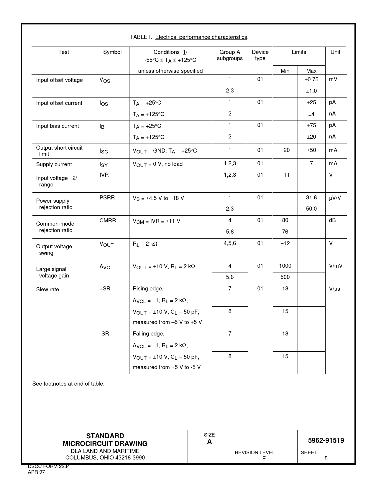 TABLE I. Electrical performance characteristics. Test Symbol Conditions 1/ Group A Device Limits Unit -55°C ≤ T subgroups type A ≤ +125°C unless otherwise specified Min Max Input offset voltage VOS 1 01 ±0.75 mV 2,3 ±1.0 Input offset current IOS TA = +25°C 1 01 ±25 pA TA = +125°C 2 ±4 nA Input bias current IB TA = +25°C 1 01 ±75 pA TA = +125°C 2 ±20 nA Output short circuit I limit SC VOUT = GND, TA = +25°C 1 01 ±20 ±50 mA Supply current ISY VOUT = 0 V, no load 1,2,3 01 7 mA IVR 1,2,3 01 ±11 V Input voltage 2/ range PSRR V Power supply S = ±4.5 V to ±18 V 1 01 31.6 µV/V rejection ratio 2,3 50.0 CMRR V Common-mode CM = IVR = ±11 V 4 01 80 dB rejection ratio 5,6 76 V Output voltage OUT RL = 2 kΩ 4,5,6 01 ±12 V swing A Large signal VO VOUT = ±10 V, RL = 2 kΩ 4 01 1000 V/mV voltage gain 5,6 500 Slew rate +SR Rising edge, 7 01 18 V/µs AVCL = +1, RL = 2 kΩ, VOUT = ±10 V, CL = 50 pF, 8 15 measured from –5 V to +5 V -SR Falling edge, 7 18 AVCL = +1, RL = 2 kΩ, VOUT = ±10 V, CL = 50 pF, 8 15 measured from +5 V to -5 V See footnotes at end of table. STANDARD SIZE 5962-91519MICROCIRCUIT DRAWINGA DLA LAND AND MARITIME REVISION LEVEL SHEET COLUMBUS, OHIO 43218-3990 E 5 DSCC FORM 2234 APR 97 Document Outline DEPARTMENT OF DEFENSE SPECIFICATION DEPARTMENT OF DEFENSE STANDARDS