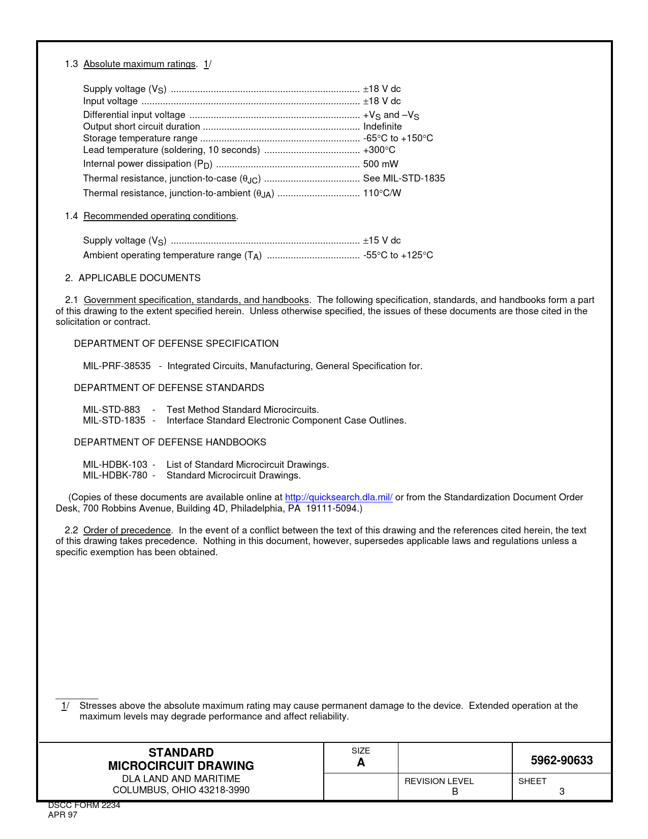 1.3 Absolute maximum ratings. 1/ Supply voltage (VS) ... ±18 V dc Input voltage .. ±18 V dc Differential input voltage .. +VS and –VS Output short circuit duration ... Indefinite Storage temperature range .. -65°C to +150°C Lead temperature (soldering, 10 seconds) .. +300°C Internal power dissipation (PD) .. 500 mW Thermal resistance, junction-to-case (θJC) .. See MIL-STD-1835 Thermal resistance, junction-to-ambient (θJA) ... 110°C/W 1.4 Recommended operating conditions. Supply voltage (VS) ... ±15 V dc Ambient operating temperature range (TA) ... -55°C to +125°C 2. APPLICABLE DOCUMENTS 2.1 Government specification, standards, and handbooks. The following specification, standards, and handbooks form a part of this drawing to the extent specified herein. Unless otherwise specified, the issues of these documents are those cited in the solicitation or contract. DEPARTMENT OF DEFENSE SPECIFICATION MIL-PRF-38535 - Integrated Circuits, Manufacturing, General Specification for. DEPARTMENT OF DEFENSE STANDARDS MIL-STD-883 - Test Method Standard Microcircuits. MIL-STD-1835 - Interface Standard Electronic Component Case Outlines. DEPARTMENT OF DEFENSE HANDBOOKS MIL-HDBK-103 - List of Standard Microcircuit Drawings. MIL-HDBK-780 - Standard Microcircuit Drawings. (Copies of these documents are available online at http://quicksearch.dla.mil/ or from the Standardization Document Order Desk, 700 Robbins Avenue, Building 4D, Philadelphia, PA 19111-5094.) 2.2 Order of precedence. In the event of a conflict between the text of this drawing and the references cited herein, the text of this drawing takes precedence. Nothing in this document, however, supersedes applicable laws and regulations unless a specific exemption has been obtained. ________ 1/ Stresses above the absolute maximum rating may cause permanent damage to the device. Extended operation at the maximum levels may degrade performance and affect reliability. STANDARD SIZE 5962-90633MICROCIRCUIT DRAWINGA DLA LAND AND MARITIME REVISION LEVEL SHEET COLUMBUS, OHIO 43218-3990 B 3 DSCC FORM 2234 APR 97 Document Outline DEPARTMENT OF DEFENSE SPECIFICATION DEPARTMENT OF DEFENSE STANDARDS