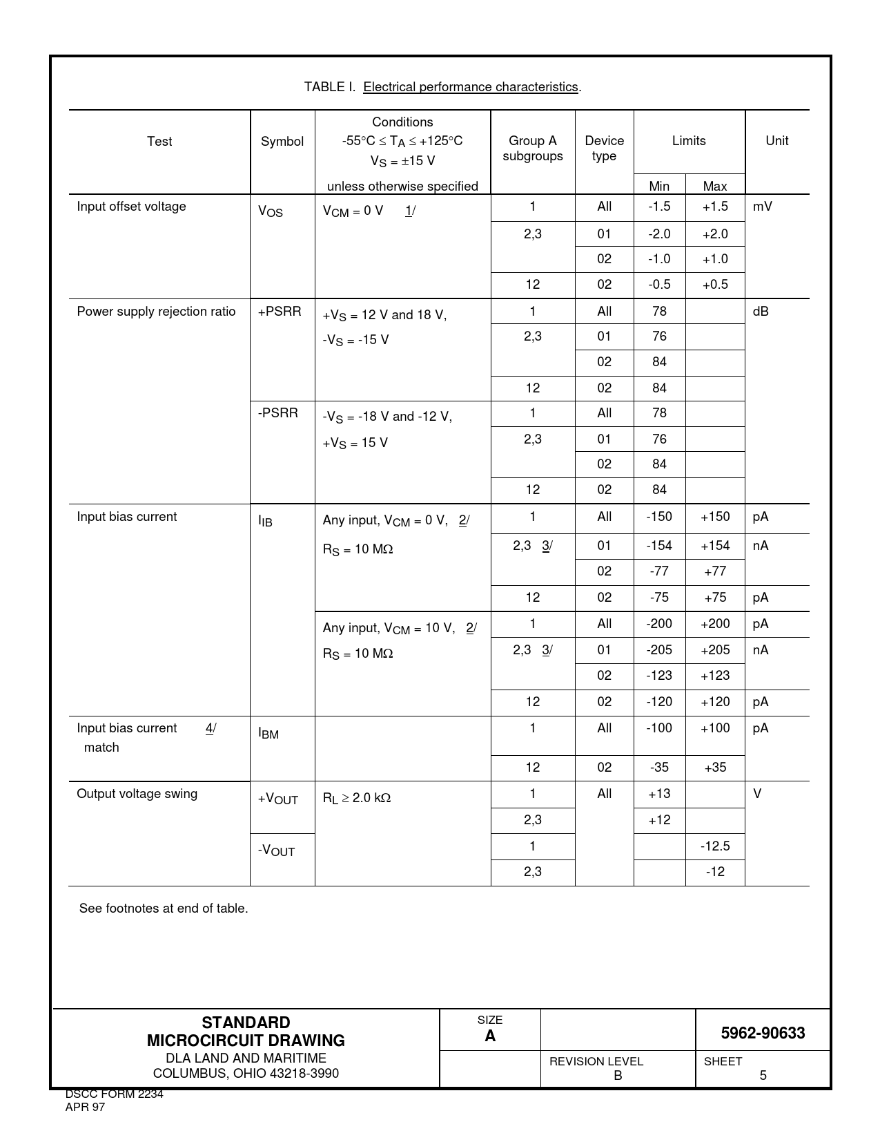 TABLE I. Electrical performance characteristics. Conditions Test Symbol -55°C ≤ TA ≤ +125°C Group A Device Limits Unit V subgroups type S = ±15 V unless otherwise specified Min Max Input offset voltage VOS VCM = 0 V 1/ 1 All -1.5 +1.5 mV 2,3 01 -2.0 +2.0 02 -1.0 +1.0 12 02 -0.5 +0.5 Power supply rejection ratio +PSRR +VS = 12 V and 18 V, 1 All 78 dB -VS = -15 V 2,3 01 76 02 84 12 02 84 -PSRR -VS = -18 V and -12 V, 1 All 78 +VS = 15 V 2,3 01 76 02 84 12 02 84 Input bias current IIB Any input, VCM = 0 V, 2/ 1 All -150 +150 pA RS = 10 MΩ 2,3 3/ 01 -154 +154 nA 02 -77 +77 12 02 -75 +75 pA Any input, VCM = 10 V, 2/ 1 All -200 +200 pA RS = 10 MΩ 2,3 3/ 01 -205 +205 nA 02 -123 +123 12 02 -120 +120 pA Input bias current 4/ IBM 1 All -100 +100 pA match 12 02 -35 +35 Output voltage swing +VOUT RL ≥ 2.0 kΩ 1 All +13 V 2,3 +12 -VOUT 1 -12.5 2,3 -12 See footnotes at end of table.