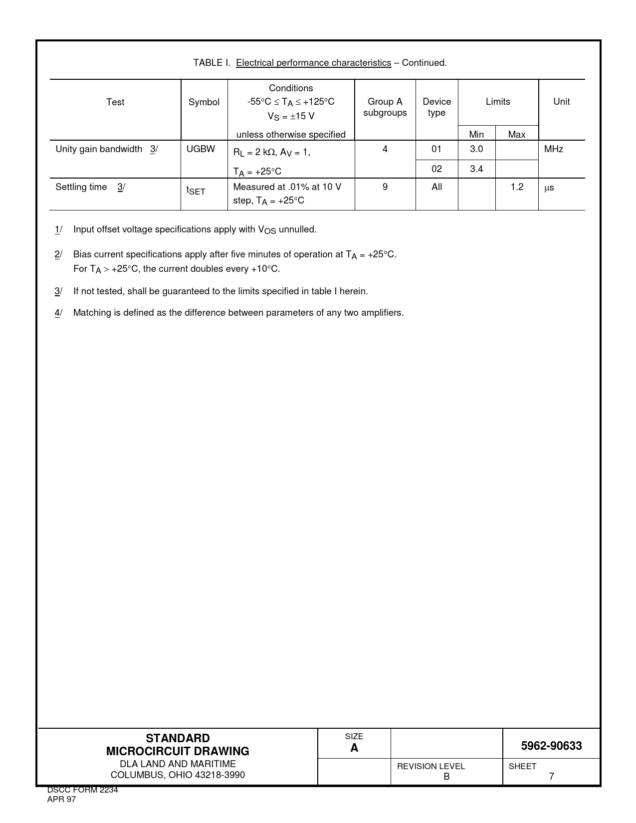 TABLE I. Electrical performance characteristics – Continued. Conditions Test Symbol -55°C ≤ TA ≤ +125°C Group A Device Limits Unit V subgroups type S = ±15 V unless otherwise specified Min Max Unity gain bandwidth 3/ UGBW RL = 2 kΩ, AV = 1, 4 01 3.0 MHz TA = +25°C 02 3.4 Settling time 3/ t 9 All 1.2 µs SET Measured at .01% at 10 V step, TA = +25°C 1/ Input offset voltage specifications apply with VOS unnulled. 2/ Bias current specifications apply after five minutes of operation at TA = +25°C. For TA > +25°C, the current doubles every +10°C. 3/ If not tested, shall be guaranteed to the limits specified in table I herein. 4/ Matching is defined as the difference between parameters of any two amplifiers. STANDARD SIZE 5962-90633MICROCIRCUIT DRAWINGA DLA LAND AND MARITIME REVISION LEVEL SHEET COLUMBUS, OHIO 43218-3990 B 7 DSCC FORM 2234 APR 97 Document Outline DEPARTMENT OF DEFENSE SPECIFICATION DEPARTMENT OF DEFENSE STANDARDS