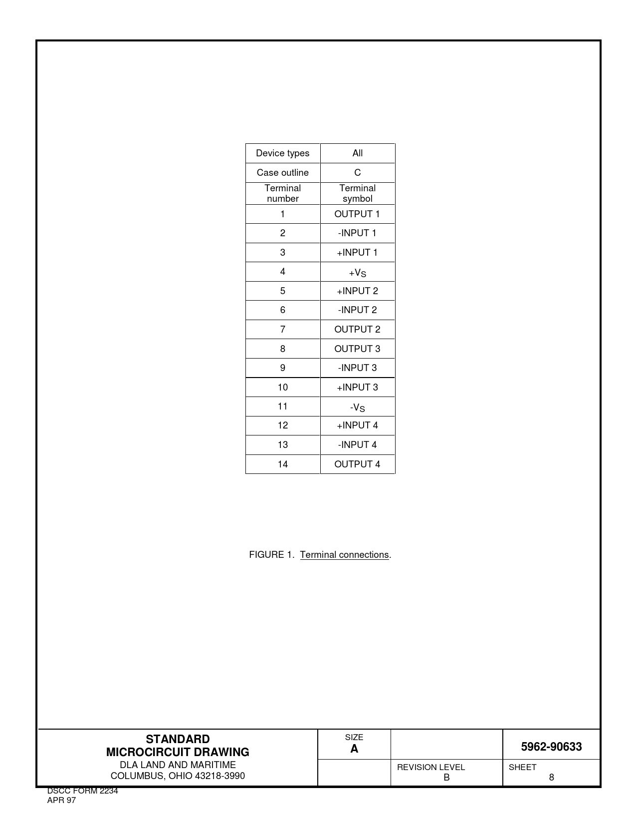 Device types All Case outline C Terminal Terminal number symbol 1 OUTPUT 1 2 -INPUT 1 3 +INPUT 1 4 +VS 5 +INPUT 2 6 -INPUT 2 7 OUTPUT 2 8 OUTPUT 3 9 -INPUT 3 10 +INPUT 3 11 -VS 12 +INPUT 4 13 -INPUT 4 14 OUTPUT 4 FIGURE 1. Terminal connections.