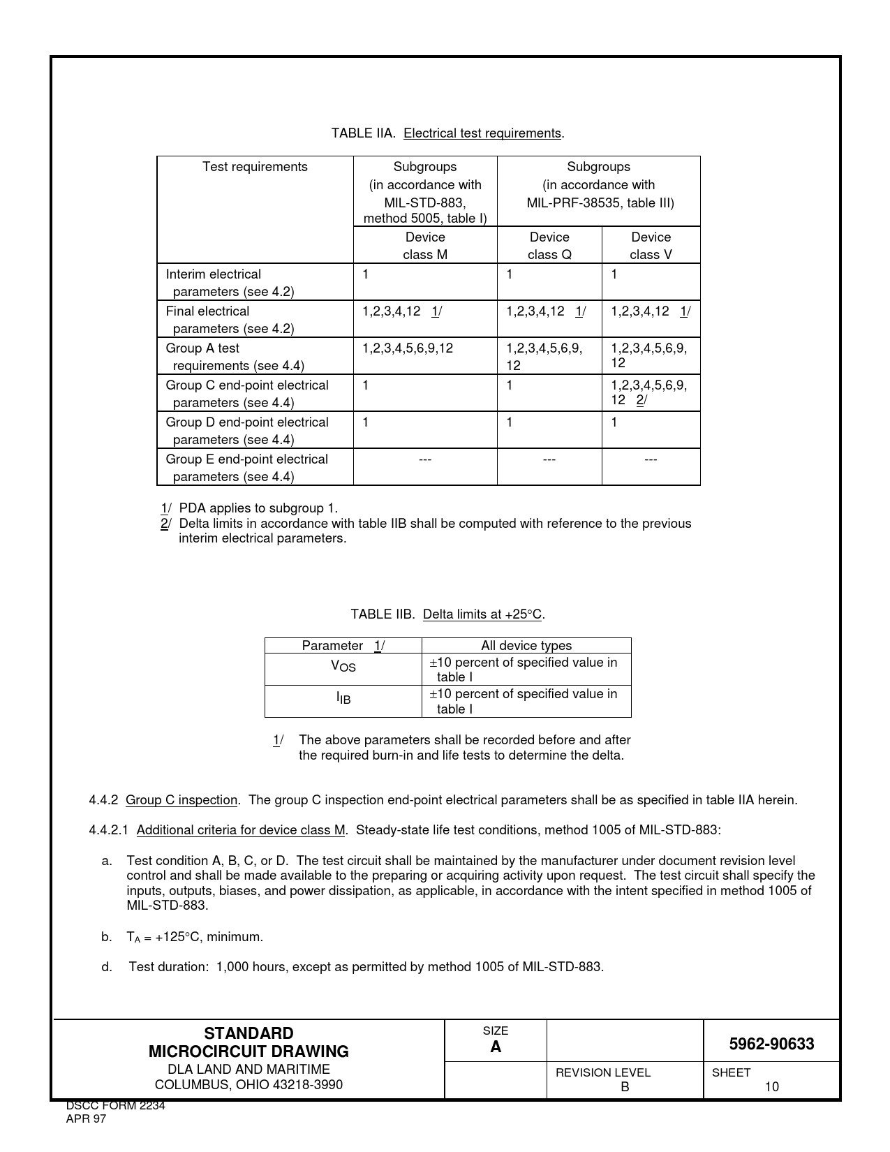 TABLE IIA. Electrical test requirements. Test requirements Subgroups Subgroups (in accordance with (in accordance with MIL-STD-883, MIL-PRF-38535, table III) method 5005, table I) Device Device Device class M class Q class V Interim electrical 1 1 1 parameters (see 4.2) Final electrical 1,2,3,4,12 1/ 1,2,3,4,12 1/ 1,2,3,4,12 1/ parameters (see 4.2) Group A test 1,2,3,4,5,6,9,12 1,2,3,4,5,6,9, 1,2,3,4,5,6,9, requirements (see 4.4) 12 12 Group C end-point electrical 1 1 1,2,3,4,5,6,9, parameters (see 4.4) 12 2/ Group D end-point electrical 1 1 1 parameters (see 4.4) Group E end-point electrical --- --- --- parameters (see 4.4) 1/ PDA applies to subgroup 1. 2/ Delta limits in accordance with table IIB shall be computed with reference to the previous interim electrical parameters. TABLE IIB. Delta limits at +25°C. Parameter 1/ All device types VOS ±10 percent of specified value in table I IIB ±10 percent of specified value in table I 1/ The above parameters shall be recorded before and after the required burn-in and life tests to determine the delta. 4.4.2 Group C inspection. The group C inspection end-point electrical parameters shall be as specified in table IIA herein. 4.4.2.1 Additional criteria for device class M. Steady-state life test conditions, method 1005 of MIL-STD-883: a. Test condition A, B, C, or D. The test circuit shall be maintained by the manufacturer under document revision level control and shall be made available to the preparing or acquiring activity upon request. The test circuit shall specify the inputs, outputs, biases, and power dissipation, as applicable, in accordance with the intent specified in method 1005 of MIL-STD-883. b. TA = +125°C, minimum. d. Test duration: 1,000 hours, except as permitted by method 1005 of MIL-STD-883. STANDARD SIZE 5962-90633MICROCIRCUIT DRAWINGA DLA LAND AND MARITIME REVISION LEVEL SHEET COLUMBUS, OHIO 43218-3990 B 10 DSCC FORM 2234 APR 97 Document Outline DEPARTMENT OF DEFENSE SPECIFICATION DEPARTMENT OF DEFENSE STANDARDS