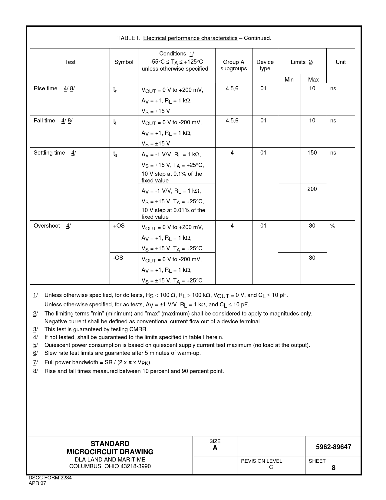 TABLE I. Electrical performance characteristics – Continued. Conditions 1/ Test Symbol -55°C ≤ TA ≤ +125°C Group A Device Limits 2/ Unit unless otherwise specified subgroups type Min Max Rise time 4/ 8/ t 4,5,6 01 10 ns r VOUT = 0 V to +200 mV, AV = +1, RL = 1 kΩ, VS = ±15 V Fall time 4/ 8/ t 4,5,6 01 10 ns f VOUT = 0 V to -200 mV, AV = +1, RL = 1 kΩ, VS = ±15 V Settling time 4/ t 4 01 150 ns s AV = -1 V/V, RL = 1 kΩ, VS = ±15 V, TA = +25°C, 10 V step at 0.1% of the fixed value A 200 V = -1 V/V, RL = 1 kΩ, VS = ±15 V, TA = +25°C, 10 V step at 0.01% of the fixed value Overshoot 4/ +OS V 4 01 30 % OUT = 0 V to +200 mV, AV = +1, RL = 1 kΩ, VS = ±15 V, TA = +25°C -OS V 30 OUT = 0 V to -200 mV, AV = +1, RL = 1 kΩ, VS = ±15 V, TA = +25°C 1/ Unless otherwise specified, for dc tests, RS < 100 Ω, RL > 100 kΩ, VOUT = 0 V, and CL ≤ 10 pF. Unless otherwise specified, for ac tests, AV = ±1 V/V, RL = 1 kΩ, and CL ≤ 10 pF. 2/ The limiting terms "min" (minimum) and "max" (maximum) shall be considered to apply to magnitudes only. Negative current shall be defined as conventional current flow out of a device terminal. 3/ This test is guaranteed by testing CMRR. 4/ If not tested, shall be guaranteed to the limits specified in table I herein. 5/ Quiescent power consumption is based on quiescent supply current test maximum (no load at the output). 6/ Slew rate test limits are guarantee after 5 minutes of warm-up. 7/ Full power bandwidth = SR / (2 x π x VPK). 8/ Rise and fall times measured between 10 percent and 90 percent point.