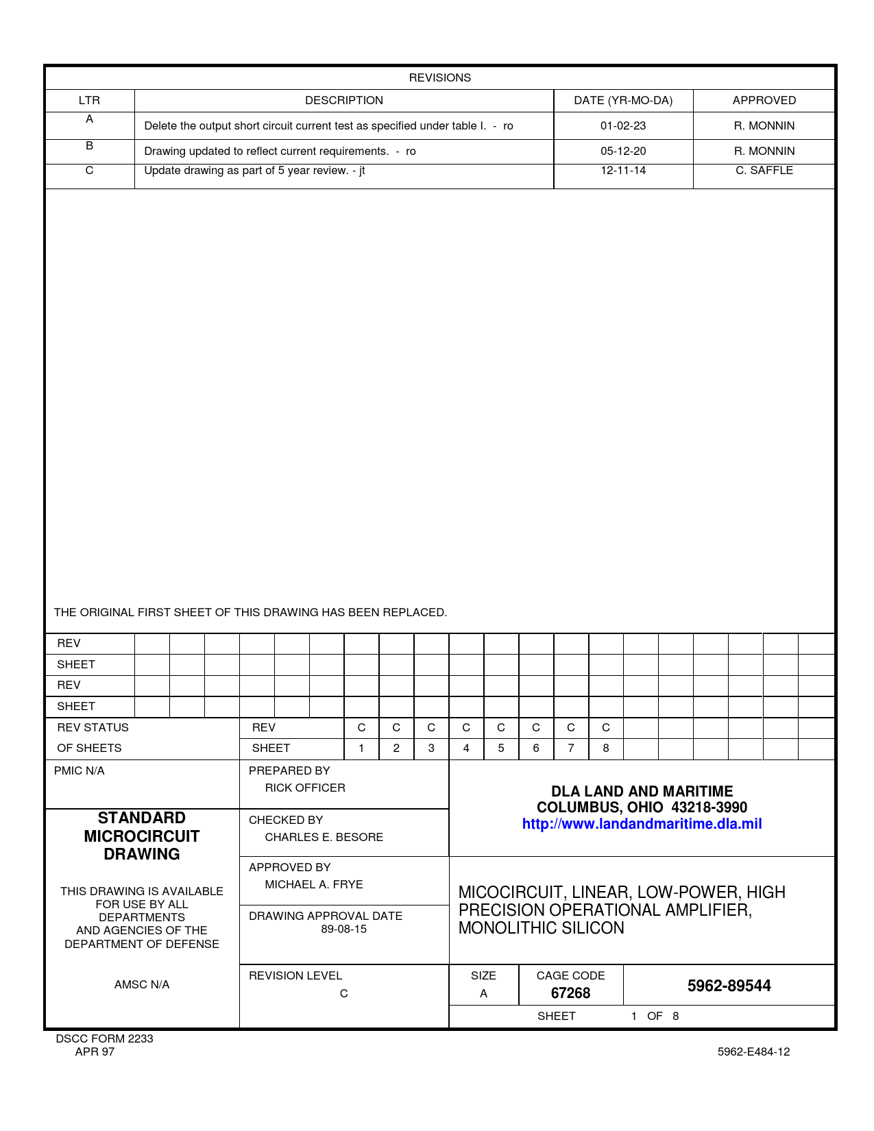 APPROVED BY MICHAEL A. FRYE THIS DRAWING IS AVAILABLE MICOCIRCUIT, LINEAR, LOW-POWER, HIGH FOR USE BY ALL PRECISION OPERATIONAL AMPLIFIER, DEPARTMENTS DRAWING APPROVAL DATE AND AGENCIES OF THE 89-08-15 MONOLITHIC SILICON DEPARTMENT OF DEFENSE REVISION LEVEL SIZE CAGE CODE AMSC N/A