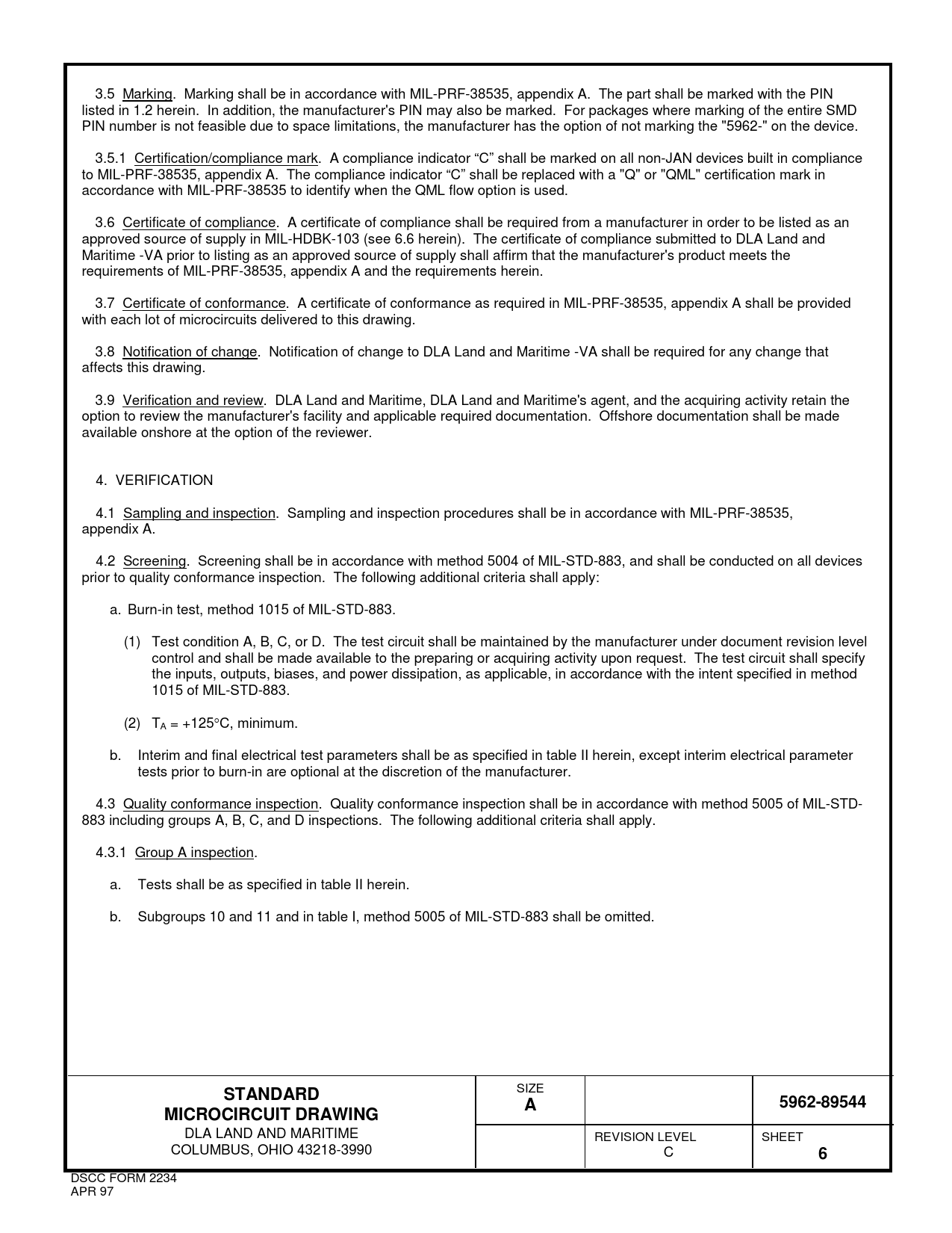 3.5 Marking. Marking shall be in accordance with MIL-PRF-38535, appendix A. The part shall be marked with the PIN listed in 1.2 herein. In addition, the manufacturer's PIN may also be marked. For packages where marking of the entire SMD PIN number is not feasible due to space limitations, the manufacturer has the option of not marking the "5962-" on the device. 3.5.1 Certification/compliance mark. A compliance indicator “C” shall be marked on all non-JAN devices built in compliance to MIL-PRF-38535, appendix A. The compliance indicator “C” shall be replaced with a "Q" or "QML" certification mark in accordance with MIL-PRF-38535 to identify when the QML flow option is used. 3.6 Certificate of compliance. A certificate of compliance shall be required from a manufacturer in order to be listed as an approved source of supply in MIL-HDBK-103 (see 6.6 herein). The certificate of compliance submitted to DLA Land and Maritime -VA prior to listing as an approved source of supply shall affirm that the manufacturer's product meets the requirements of MIL-PRF-38535, appendix A and the requirements herein. 3.7 Certificate of conformance. A certificate of conformance as required in MIL-PRF-38535, appendix A shall be provided with each lot of microcircuits delivered to this drawing. 3.8 Notification of change. Notification of change to DLA Land and Maritime -VA shall be required for any change that affects this drawing. 3.9 Verification and review. DLA Land and Maritime, DLA Land and Maritime's agent, and the acquiring activity retain the option to review the manufacturer's facility and applicable required documentation. Offshore documentation shall be made available onshore at the option of the reviewer. 4. VERIFICATION 4.1 Sampling and inspection. Sampling and inspection procedures shall be in accordance with MIL-PRF-38535, appendix A. 4.2 Screening. Screening shall be in accordance with method 5004 of MIL-STD-883, and shall be conducted on all devices prior to quality conformance inspection. The following additional criteria shall apply: a. Burn-in test, method 1015 of MIL-STD-883. (1) Test condition A, B, C, or D. The test circuit shall be maintained by the manufacturer under document revision level control and shall be made available to the preparing or acquiring activity upon request. The test circuit shall specify the inputs, outputs, biases, and power dissipation, as applicable, in accordance with the intent specified in method 1015 of MIL-STD-883. (2) TA = +125°C, minimum. b. Interim and final electrical test parameters shall be as specified in table II herein, except interim electrical parameter tests prior to burn-in are optional at the discretion of the manufacturer. 4.3 Quality conformance inspection. Quality conformance inspection shall be in accordance with method 5005 of MIL-STD- 883 including groups A, B, C, and D inspections. The following additional criteria shall apply. 4.3.1 Group A inspection. a. Tests shall be as specified in table II herein. b. Subgroups 10 and 11 and in table I, method 5005 of MIL-STD-883 shall be omitted. STANDARD SIZE A5962-89544MICROCIRCUIT DRAWING DLA LAND AND MARITIME REVISION LEVEL SHEET COLUMBUS, OHIO 43218-3990 C 6 DSCC FORM 2234 APR 97