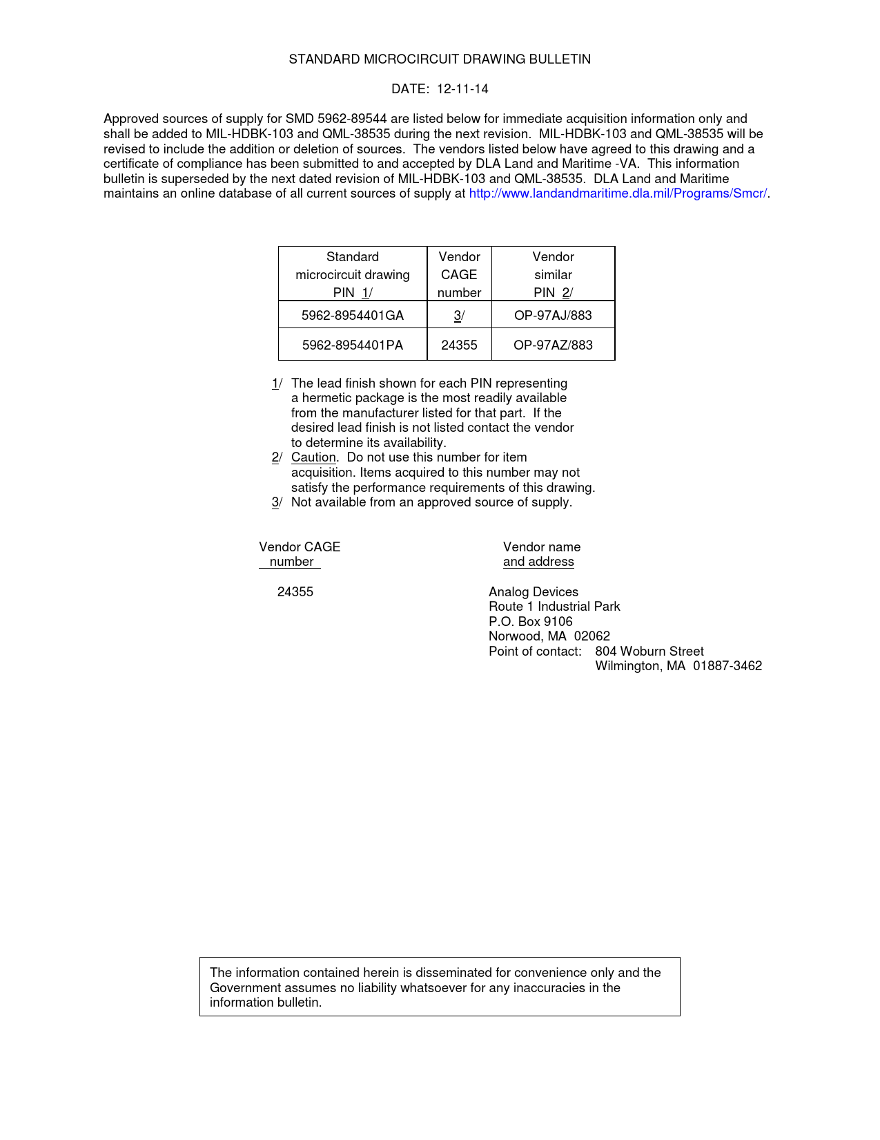 STANDARD MICROCIRCUIT DRAWING BULLETIN DATE: 12-11-14 Approved sources of supply for SMD 5962-89544 are listed below for immediate acquisition information only and shall be added to MIL-HDBK-103 and QML-38535 during the next revision. MIL-HDBK-103 and QML-38535 will be revised to include the addition or deletion of sources. The vendors listed below have agreed to this drawing and a certificate of compliance has been submitted to and accepted by DLA Land and Maritime -VA. This information bulletin is superseded by the next dated revision of MIL-HDBK-103 and QML-38535. DLA Land and Maritime maintains an online database of all current sources of supply at http://www.landandmaritime.dla.mil/Programs/Smcr/. Standard Vendor Vendor microcircuit drawing CAGE similar PIN 1/ number PIN 2/ 5962-8954401GA 3/ OP-97AJ/883 5962-8954401PA 24355 OP-97AZ/883 1/ The lead finish shown for each PIN representing a hermetic package is the most readily available from the manufacturer listed for that part. If the desired lead finish is not listed contact the vendor to determine its availability. 2/ Caution. Do not use this number for item acquisition. Items acquired to this number may not satisfy the performance requirements of this drawing. 3/ Not available from an approved source of supply. Vendor CAGE Vendor name number and address 24355 Analog Devices Route 1 Industrial Park P.O. Box 9106 Norwood, MA 02062 Point of contact: 804 Woburn Street Wilmington, MA 01887-3462 The information contained herein is disseminated for convenience only and the Government assumes no liability whatsoever for any inaccuracies in the information bulletin.