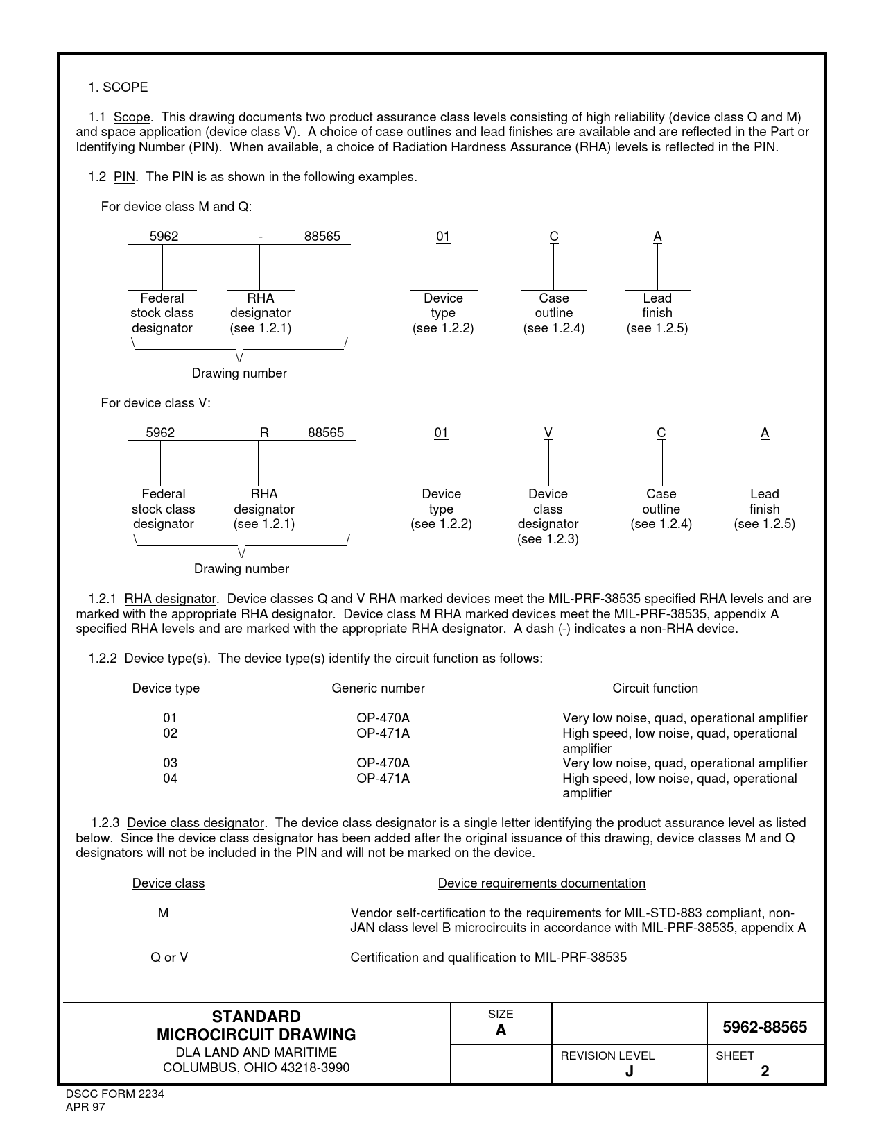 1. SCOPE 1.1 Scope. This drawing documents two product assurance class levels consisting of high reliability (device class Q and M) and space application (device class V). A choice of case outlines and lead finishes are available and are reflected in the Part or Identifying Number (PIN). When available, a choice of Radiation Hardness Assurance (RHA) levels is reflected in the PIN. 1.2 PIN. The PIN is as shown in the following examples. For device class M and Q: 5962 - 88565 01 C A Federal RHA Device Case Lead stock class designator type outline finish designator (see 1.2.1) (see 1.2.2) (see 1.2.4) (see 1.2.5) \ / \/ Drawing number For device class V: 5962 R 88565 01 V C A Federal RHA Device Device Case Lead stock class designator type class outline finish designator (see 1.2.1) (see 1.2.2) designator (see 1.2.4) (see 1.2.5) \ / (see 1.2.3) \/ Drawing number 1.2.1 RHA designator. Device classes Q and V RHA marked devices meet the MIL-PRF-38535 specified RHA levels and are marked with the appropriate RHA designator. Device class M RHA marked devices meet the MIL-PRF-38535, appendix A specified RHA levels and are marked with the appropriate RHA designator. A dash (-) indicates a non-RHA device. 1.2.2 Device type(s). The device type(s) identify the circuit function as follows: Device type Generic number Circuit function 01 OP-470A Very low noise, quad, operational amplifier 02 OP-471A High speed, low noise, quad, operational amplifier 03 OP-470A Very low noise, quad, operational amplifier 04 OP-471A High speed, low noise, quad, operational amplifier 1.2.3 Device class designator. The device class designator is a single letter identifying the product assurance level as listed below. Since the device class designator has been added after the original issuance of this drawing, device classes M and Q designators will not be included in the PIN and will not be marked on the device. Device class Device requirements documentation M Vendor self-certification to the requirements for MIL-STD-883 compliant, non- JAN class level B microcircuits in accordance with MIL-PRF-38535, appendix A Q or V Certification and qualification to MIL-PRF-38535