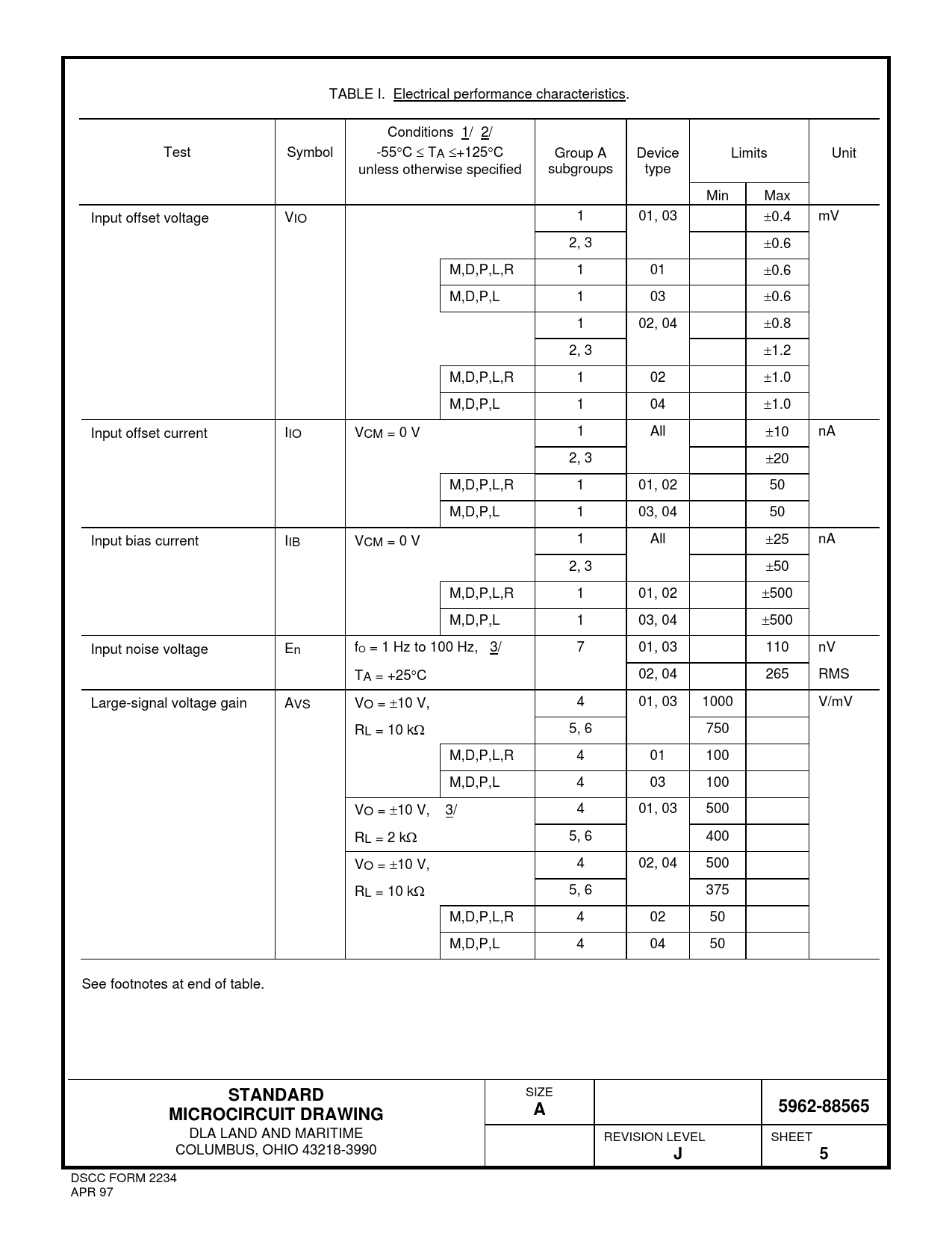 TABLE I. Electrical performance characteristics. Conditions 1/ 2/ Test Symbol -55C TA +125C Group A Device Limits Unit unless otherwise specified subgroups type Min Max Input offset voltage VIO 1 01, 03 0.4 mV 2, 3 0.6 M,D,P,L,R 1 01 0.6 M,D,P,L 1 03 0.6 1 02, 04 0.8 2, 3 1.2 M,D,P,L,R 1 02 1.0 M,D,P,L 1 04 1.0 Input offset current IIO VCM = 0 V 1 All 10 nA 2, 3 20 M,D,P,L,R 1 01, 02 50 M,D,P,L 1 03, 04 50 Input bias current IIB VCM = 0 V 1 All 25 nA 2, 3 50 M,D,P,L,R 1 01, 02 500 M,D,P,L 1 03, 04 500 Input noise voltage En fO = 1 Hz to 100 Hz, 3/ 7 01, 03 110 nV TA = +25C 02, 04 265 RMS Large-signal voltage gain AVS VO = 10 V, 4 01, 03 1000 V/mV RL = 10 k 5, 6 750 M,D,P,L,R 4 01 100 M,D,P,L 4 03 100 VO = 10 V, 3/ 4 01, 03 500 RL = 2 k 5, 6 400 VO = 10 V, 4 02, 04 500 RL = 10 k 5, 6 375 M,D,P,L,R 4 02 50 M,D,P,L 4 04 50 See footnotes at end of table.