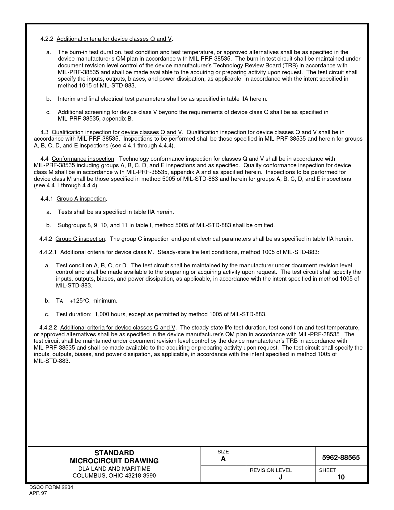 4.2.2 Additional criteria for device classes Q and V. a. The burn-in test duration, test condition and test temperature, or approved alternatives shall be as specified in the device manufacturer's QM plan in accordance with MIL-PRF-38535. The burn-in test circuit shall be maintained under document revision level control of the device manufacturer's Technology Review Board (TRB) in accordance with MIL-PRF-38535 and shall be made available to the acquiring or preparing activity upon request. The test circuit shall specify the inputs, outputs, biases, and power dissipation, as applicable, in accordance with the intent specified in method 1015 of MIL-STD-883. b. Interim and final electrical test parameters shall be as specified in table IIA herein. c. Additional screening for device class V beyond the requirements of device class Q shall be as specified in MIL-PRF-38535, appendix B. 4.3 Qualification inspection for device classes Q and V. Qualification inspection for device classes Q and V shall be in accordance with MIL-PRF-38535. Inspections to be performed shall be those specified in MIL-PRF-38535 and herein for groups A, B, C, D, and E inspections (see 4.4.1 through 4.4.4). 4.4 Conformance inspection. Technology conformance inspection for classes Q and V shall be in accordance with MIL-PRF-38535 including groups A, B, C, D, and E inspections and as specified. Quality conformance inspection for device class M shall be in accordance with MIL-PRF-38535, appendix A and as specified herein. Inspections to be performed for device class M shall be those specified in method 5005 of MIL-STD-883 and herein for groups A, B, C, D, and E inspections (see 4.4.1 through 4.4.4). 4.4.1 Group A inspection. a. Tests shall be as specified in table IIA herein. b. Subgroups 8, 9, 10, and 11 in table I, method 5005 of MIL-STD-883 shall be omitted. 4.4.2 Group C inspection. The group C inspection end-point electrical parameters shall be as specified in table IIA herein. 4.4.2.1 Additional criteria for device class M. Steady-state life test conditions, method 1005 of MIL-STD-883: a. Test condition A, B, C, or D. The test circuit shall be maintained by the manufacturer under document revision level control and shall be made available to the preparing or acquiring activity upon request. The test circuit shall specify the inputs, outputs, biases, and power dissipation, as applicable, in accordance with the intent specified in method 1005 of MIL-STD-883. b. TA = +125C, minimum. c. Test duration: 1,000 hours, except as permitted by method 1005 of MIL-STD-883. 4.4.2.2 Additional criteria for device classes Q and V. The steady-state life test duration, test condition and test temperature, or approved alternatives shall be as specified in the device manufacturer's QM plan in accordance with MIL-PRF-38535. The test circuit shall be maintained under document revision level control by the device manufacturer's TRB in accordance with MIL-PRF-38535 and shall be made available to the acquiring or preparing activity upon request. The test circuit shall specify the inputs, outputs, biases, and power dissipation, as applicable, in accordance with the intent specified in method 1005 of MIL-STD-883.