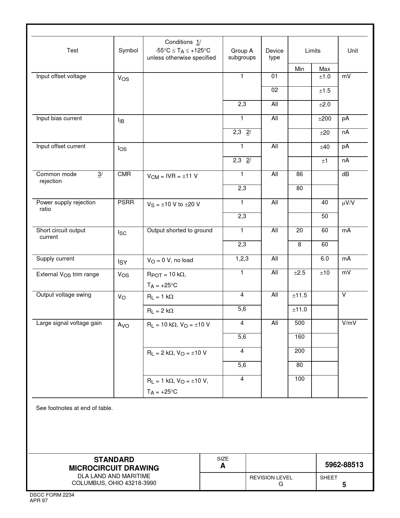 Conditions 1/ Test Symbol -55°C ≤ TA ≤ +125°C Group A Device Limits Unit unless otherwise specified subgroups type Min Max Input offset voltage VOS 1 01 ±1.0 mV 02 ±1.5 2,3 All ±2.0 Input bias current IIB 1 All ±200 pA 2,3 2/ ±20 nA Input offset current IOS 1 All ±40 pA 2,3 2/ ±1 nA Common mode 3/ CMR VCM = IVR = ±11 V 1 All 86 dB rejection 2,3 80 Power supply rejection PSRR VS = ±10 V to ±20 V 1 All 40 µV/V ratio 2,3 50 Short circuit output ISC Output shorted to ground 1 All 20 60 mA current 2,3 8 60 Supply current I SY VO = 0 V, no load 1,2,3 All 6.0 mA External V 1 All ±2.5 ±10 mV OS trim range VOS RPOT = 10 kΩ, TA = +25°C Output voltage swing VO RL = 1 kΩ 4 All ±11.5 V RL = 2 kΩ 5,6 ±11.0 Large signal voltage gain AVO RL = 10 kΩ, VO = ±10 V 4 All 500 V/mV 5,6 160 RL = 2 kΩ, VO = ±10 V 4 200 5,6 80 R 4 100 L = 1 kΩ, VO = ±10 V, TA = +25°C See footnotes at end of table.