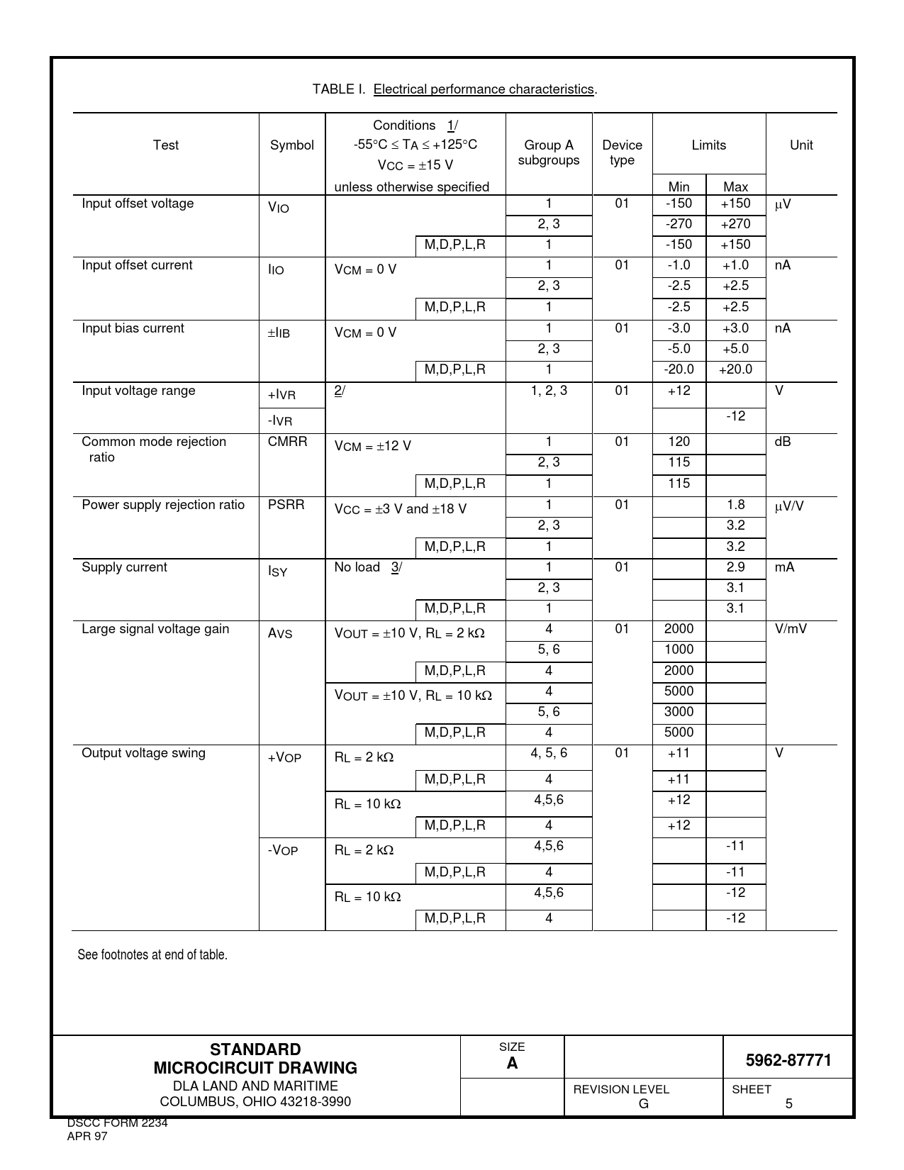 TABLE I. Electrical performance characteristics. Conditions 1/ Test Symbol -55C TA +125C Group A Device Limits Unit V subgroups type CC = 15 V unless otherwise specified Min Max Input offset voltage VIO 1 01 -150 +150 V 2, 3 -270 +270 M,D,P,L,R 1 -150 +150 Input offset current IIO VCM = 0 V 1 01 -1.0 +1.0 nA 2, 3 -2.5 +2.5 M,D,P,L,R 1 -2.5 +2.5 Input bias current IIB VCM = 0 V 1 01 -3.0 +3.0 nA 2, 3 -5.0 +5.0 M,D,P,L,R 1 -20.0 +20.0 Input voltage range +IVR 2/ 1, 2, 3 01 +12 V -IVR -12 Common mode rejection CMRR VCM = 12 V 1 01 120 dB ratio 2, 3 115 M,D,P,L,R 1 115 Power supply rejection ratio PSRR VCC = 3 V and 18 V 1 01 1.8 V/V 2, 3 3.2 M,D,P,L,R 1 3.2 Supply current ISY No load 3/ 1 01 2.9 mA 2, 3 3.1 M,D,P,L,R 1 3.1 Large signal voltage gain AVS VOUT = 10 V, RL = 2 k 4 01 2000 V/mV 5, 6 1000 M,D,P,L,R 4 2000 VOUT = 10 V, RL = 10 k 4 5000 5, 6 3000 M,D,P,L,R 4 5000 Output voltage swing +VOP RL = 2 k 4, 5, 6 01 +11 V M,D,P,L,R 4 +11 RL = 10 k 4,5,6 +12 M,D,P,L,R 4 +12 -VOP RL = 2 k 4,5,6 -11 M,D,P,L,R 4 -11 RL = 10 k 4,5,6 -12 M,D,P,L,R 4 -12 See footnotes at end of table. STANDARD SIZE 5962-87771MICROCIRCUIT DRAWINGA DLA LAND AND MARITIME REVISION LEVEL SHEET COLUMBUS, OHIO 43218-3990 G 5 DSCC FORM 2234 APR 97