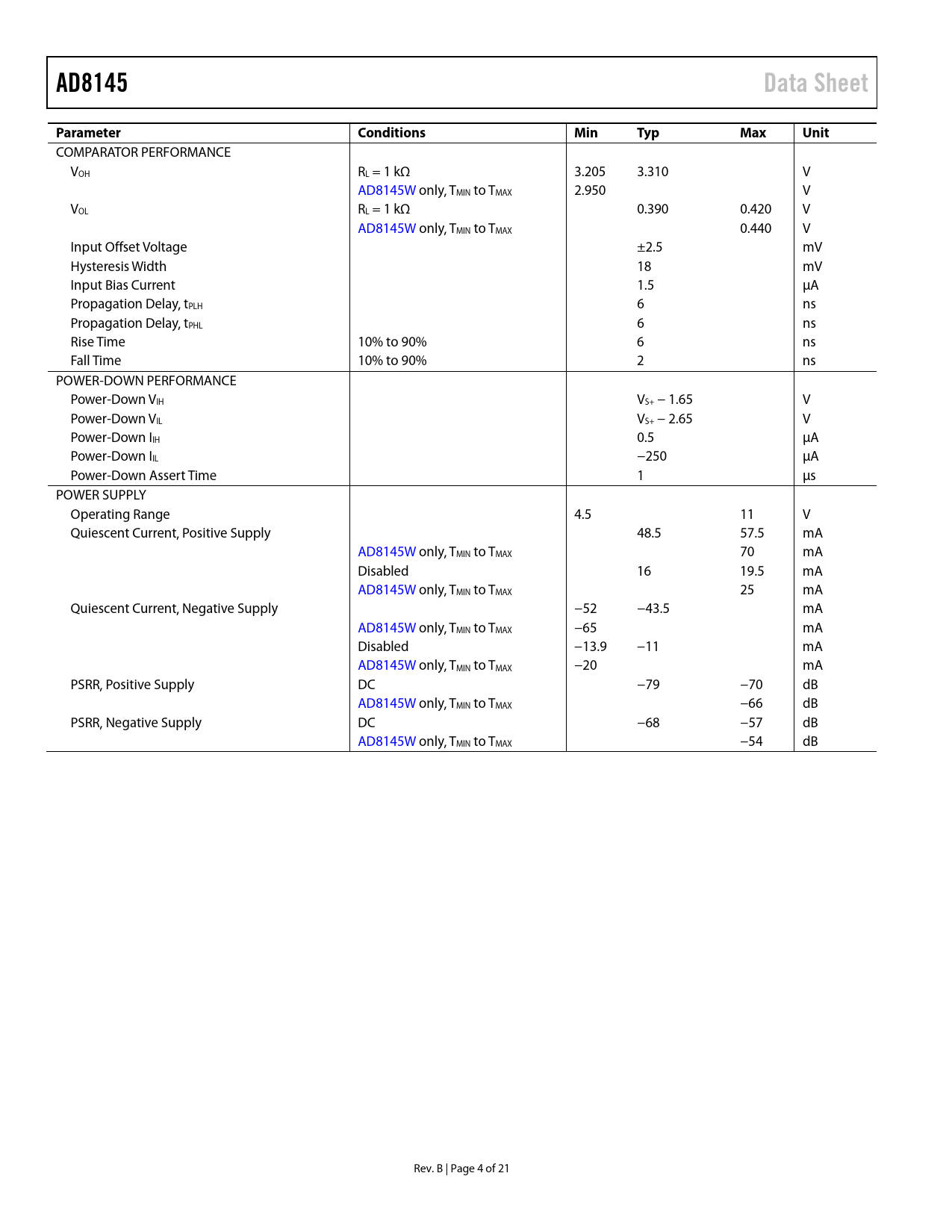 AD8145Data SheetParameterConditionsMinTypMaxUnit COMPARATOR PERFORMANCE VOH RL = 1 kΩ 3.205 3.310 V AD8145W only, TMIN to TMAX 2.950 V VOL RL = 1 kΩ 0.390 0.420 V AD8145W only, TMIN to TMAX 0.440 V Input Offset Voltage ±2.5 mV Hysteresis Width 18 mV Input Bias Current 1.5 µA Propagation Delay, tPLH 6 ns Propagation Delay, tPHL 6 ns Rise Time 10% to 90% 6 ns Fall Time 10% to 90% 2 ns POWER-DOWN PERFORMANCE Power-Down VIH VS+ − 1.65 V Power-Down VIL VS+ − 2.65 V Power-Down IIH 0.5 µA Power-Down IIL −250 µA Power-Down Assert Time 1 µs POWER SUPPLY Operating Range 4.5 11 V Quiescent Current, Positive Supply 48.5 57.5 mA AD8145W only, TMIN to TMAX 70 mA Disabled 16 19.5 mA AD8145W only, TMIN to TMAX 25 mA Quiescent Current, Negative Supply −52 −43.5 mA AD8145W only, TMIN to TMAX −65 mA Disabled −13.9 −11 mA AD8145W only, TMIN to TMAX −20 mA PSRR, Positive Supply DC −79 −70 dB AD8145W only, TMIN to TMAX −66 dB PSRR, Negative Supply DC −68 −57 dB AD8145W only, TMIN to TMAX −54 dB Rev. B | Page 4 of 21 Document Outline FEATURES APPLICATIONS FUNCTIONAL BLOCK DIAGRAM GENERAL DESCRIPTION TABLE OF CONTENTS REVISION HISTORY SPECIFICATIONS ABSOLUTE MAXIMUM RATINGS THERMAL RESISTANCE MAXIMUM POWER DISSIPATION ESD CAUTION PIN CONFIGURATION AND FUNCTION DESCRIPTION TYPICAL PERFORMANCE CHARACTERISTICS THEORY OF OPERATION APPLICATIONS INFORMATION OVERVIEW BASIC CLOSED-LOOP GAIN CONFIGURATIONS TERMINATING THE INPUT INPUT CLAMPING PCB LAYOUT CONSIDERATIONS Minimizing Parasitic Feedback Reactances Maximizing Heat Removal DRIVING A CAPACITIVE LOAD POWER-DOWN COMPARATORS SYNC PULSE EXTRACTION USING COMPARATORS OUTLINE DIMENSIONS ORDERING GUIDE AUTOMOTIVE PRODUCTS
