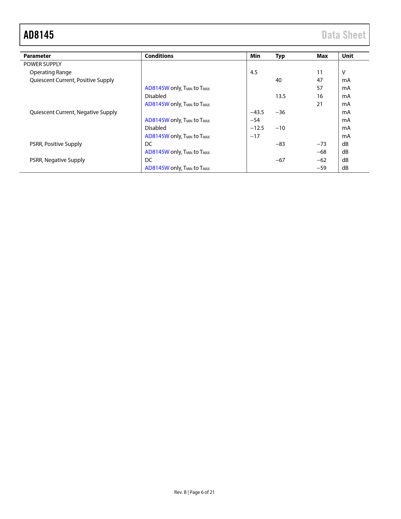 AD8145Data SheetParameterConditionsMinTypMaxUnit POWER SUPPLY Operating Range 4.5 11 V Quiescent Current, Positive Supply 40 47 mA AD8145W only, TMIN to TMAX 57 mA Disabled 13.5 16 mA AD8145W only, TMIN to TMAX 21 mA Quiescent Current, Negative Supply −43.5 −36 mA AD8145W only, TMIN to TMAX −54 mA Disabled −12.5 −10 mA AD8145W only, TMIN to TMAX −17 mA PSRR, Positive Supply DC −83 −73 dB AD8145W only, TMIN to TMAX −68 dB PSRR, Negative Supply DC −67 −62 dB AD8145W only, TMIN to TMAX −59 dB Rev. B | Page 6 of 21 Document Outline FEATURES APPLICATIONS FUNCTIONAL BLOCK DIAGRAM GENERAL DESCRIPTION TABLE OF CONTENTS REVISION HISTORY SPECIFICATIONS ABSOLUTE MAXIMUM RATINGS THERMAL RESISTANCE MAXIMUM POWER DISSIPATION ESD CAUTION PIN CONFIGURATION AND FUNCTION DESCRIPTION TYPICAL PERFORMANCE CHARACTERISTICS THEORY OF OPERATION APPLICATIONS INFORMATION OVERVIEW BASIC CLOSED-LOOP GAIN CONFIGURATIONS TERMINATING THE INPUT INPUT CLAMPING PCB LAYOUT CONSIDERATIONS Minimizing Parasitic Feedback Reactances Maximizing Heat Removal DRIVING A CAPACITIVE LOAD POWER-DOWN COMPARATORS SYNC PULSE EXTRACTION USING COMPARATORS OUTLINE DIMENSIONS ORDERING GUIDE AUTOMOTIVE PRODUCTS