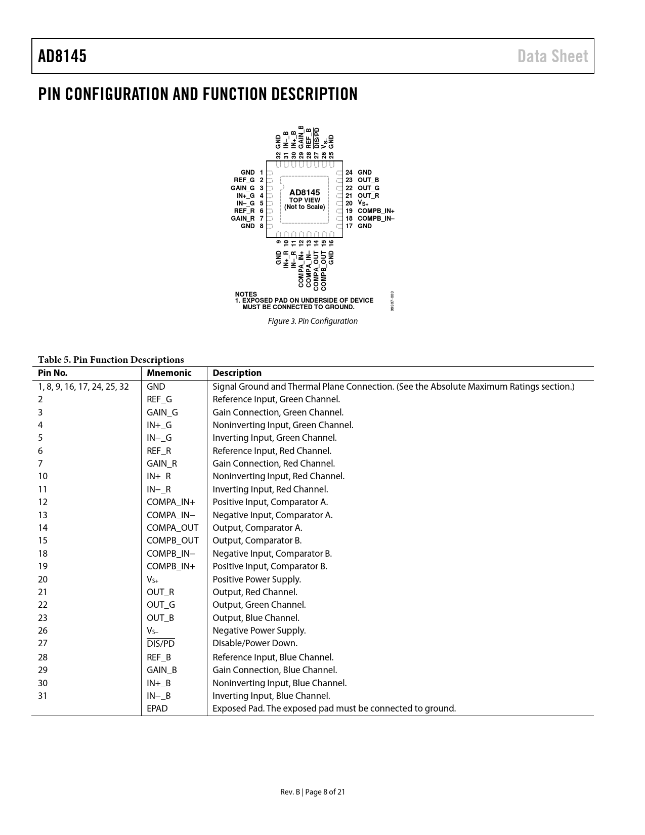 1, 8, 9, 16, 17, 24, 25, 32 GND Signal Ground and Thermal Plane Connection. (See the Absolute Maximum Ratings section.) 2 REF_G Reference Input, Green Channel. 3 GAIN_G Gain Connection, Green Channel. 4 IN+_G Noninverting Input, Green Channel. 5 IN−_G Inverting Input, Green Channel. 6 REF_R Reference Input, Red Channel. 7 GAIN_R Gain Connection, Red Channel. 10 IN+_R Noninverting Input, Red Channel. 11 IN−_R Inverting Input, Red Channel. 12 COMPA_IN+ Positive Input, Comparator A. 13 COMPA_IN− Negative Input, Comparator A. 14 COMPA_OUT Output, Comparator A. 15 COMPB_OUT Output, Comparator B. 18 COMPB_IN− Negative Input, Comparator B. 19 COMPB_IN+ Positive Input, Comparator B. 20 VS+ Positive Power Supply. 21 OUT_R Output, Red Channel. 22 OUT_G Output, Green Channel. 23 OUT_B Output, Blue Channel. 26 VS− Negative Power Supply. 27 DIS/PD Disable/Power Down. 28 REF_B Reference Input, Blue Channel. 29 GAIN_B Gain Connection, Blue Channel. 30 IN+_B Noninverting Input, Blue Channel. 31 IN−_B Inverting Input, Blue Channel. EPAD Exposed Pad. The exposed pad must be connected to ground. Rev. B | Page 8 of 21 Document Outline FEATURES APPLICATIONS FUNCTIONAL BLOCK DIAGRAM GENERAL DESCRIPTION TABLE OF CONTENTS REVISION HISTORY SPECIFICATIONS ABSOLUTE MAXIMUM RATINGS THERMAL RESISTANCE MAXIMUM POWER DISSIPATION ESD CAUTION PIN CONFIGURATION AND FUNCTION DESCRIPTION TYPICAL PERFORMANCE CHARACTERISTICS THEORY OF OPERATION APPLICATIONS INFORMATION OVERVIEW BASIC CLOSED-LOOP GAIN CONFIGURATIONS TERMINATING THE INPUT INPUT CLAMPING PCB LAYOUT CONSIDERATIONS Minimizing Parasitic Feedback Reactances Maximizing Heat Removal DRIVING A CAPACITIVE LOAD POWER-DOWN COMPARATORS SYNC PULSE EXTRACTION USING COMPARATORS OUTLINE DIMENSIONS ORDERING GUIDE AUTOMOTIVE PRODUCTS