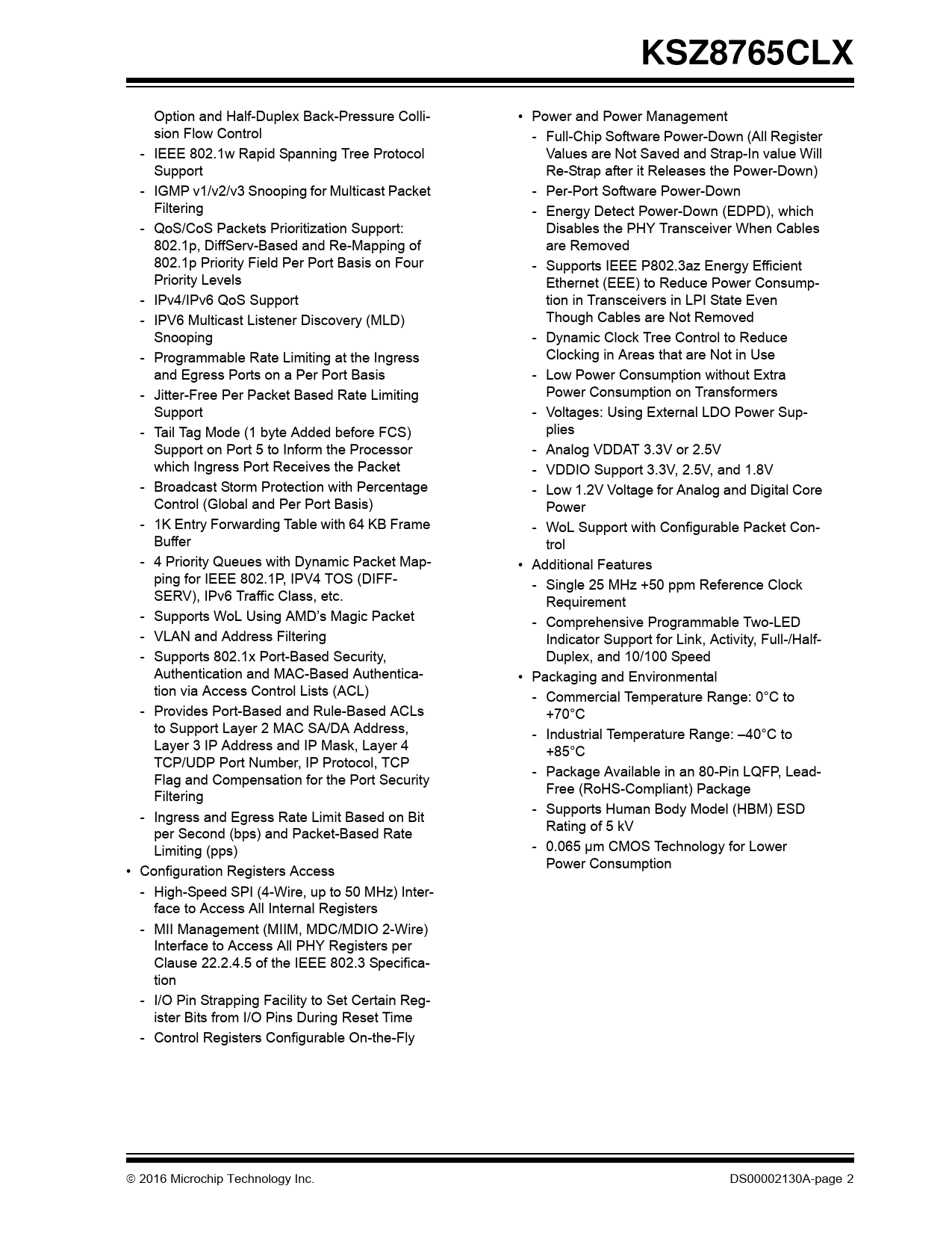 Option and Half-Duplex Back-Pressure Colli- • Power and Power Management sion Flow Control - Full-Chip Software Power-Down (All Register - IEEE 802.1w Rapid Spanning Tree Protocol Values are Not Saved and Strap-In value Will Support Re-Strap after it Releases the Power-Down) - IGMP v1/v2/v3 Snooping for Multicast Packet - Per-Port Software Power-Down Filtering - Energy Detect Power-Down (EDPD), which - QoS/CoS Packets Prioritization Support: Disables the PHY Transceiver When Cables 802.1p, DiffServ-Based and Re-Mapping of are Removed 802.1p Priority Field Per Port Basis on Four - Supports IEEE P802.3az Energy Efficient Priority Levels Ethernet (EEE) to Reduce Power Consump- - IPv4/IPv6 QoS Support tion in Transceivers in LPI State Even - IPV6 Multicast Listener Discovery (MLD) Though Cables are Not Removed Snooping - Dynamic Clock Tree Control to Reduce - Programmable Rate Limiting at the Ingress Clocking in Areas that are Not in Use and Egress Ports on a Per Port Basis - Low Power Consumption without Extra - Jitter-Free Per Packet Based Rate Limiting Power Consumption on Transformers Support - Voltages: Using External LDO Power Sup- - Tail Tag Mode (1 byte Added before FCS) plies Support on Port 5 to Inform the Processor - Analog VDDAT 3.3V or 2.5V which Ingress Port Receives the Packet - VDDIO Support 3.3V, 2.5V, and 1.8V - Broadcast Storm Protection with Percentage - Low 1.2V Voltage for Analog and Digital Core Control (Global and Per Port Basis) Power - 1K Entry Forwarding Table with 64 KB Frame - WoL Support with Configurable Packet Con- Buffer trol - 4 Priority Queues with Dynamic Packet Map- • Additional Features ping for IEEE 802.1P, IPV4 TOS (DIFF- - Single 25 MHz +50 ppm Reference Clock SERV), IPv6 Traffic Class, etc. Requirement - Supports WoL Using AMD’s Magic Packet - Comprehensive Programmable Two-LED - VLAN and Address Filtering Indicator Support for Link, Activity, Full-/Half- - Supports 802.1x Port-Based Security, Duplex, and 10/100 Speed Authentication and MAC-Based Authentica- • Packaging and Environmental tion via Access Control Lists (ACL) - Commercial Temperature Range: 0°C to - Provides Port-Based and Rule-Based ACLs +70°C to Support Layer 2 MAC SA/DA Address, - Industrial Temperature Range: –40°C to Layer 3 IP Address and IP Mask, Layer 4 +85°C TCP/UDP Port Number, IP Protocol, TCP Flag and Compensation for the Port Security - Package Available in an 80-Pin LQFP, Lead- Filtering Free (RoHS-Compliant) Package - Ingress and Egress Rate Limit Based on Bit - Supports Human Body Model (HBM) ESD per Second (bps) and Packet-Based Rate Rating of 5 kV Limiting (pps) - 0.065 µm CMOS Technology for Lower • Configuration Registers Access Power Consumption - High-Speed SPI (4-Wire, up to 50 MHz) Inter- face to Access All Internal Registers - MII Management (MIIM, MDC/MDIO 2-Wire) Interface to Access All PHY Registers per Clause 22.2.4.5 of the IEEE 802.3 Specifica- tion - I/O Pin Strapping Facility to Set Certain Reg- ister Bits from I/O Pins During Reset Time - Control Registers Configurable On-the-Fly  2016 Microchip Technology Inc. DS00002130A-page 2 Document Outline 1.0 Introduction 1.1 General Description 2.0 Pin Description and Configuration 3.0 Functional Description 3.1 Physical Layer (PHY) 3.2 Media Access Controller (MAC) Operation 3.3 Switch Core 3.4 Power and Power Management 3.5 Interfaces 3.6 Advanced Functionality 4.0 Device Registers 4.1 Register Map 4.2 Port Registers 4.3 Advanced Control Registers 4.4 Static MAC Address Table 4.5 VLAN Table 4.6 Dynamic MAC Address Table 4.7 PME Indirect Registers 4.8 ACL Rule Table and ACL Indirect Registers 4.9 EEE Indirect Registers 4.10 Management Information Base (MIB) Counters 4.11 MIIM Registers 5.0 Operational Characteristics 5.1 Absolute Maximum Ratings* 5.2 Operating Ratings** 6.0 Electrical Characteristics 7.0 Timing Diagrams 8.0 Reset Circuit 9.0 Selection of Isolation Transformer 10.0 Selection of Reference Crystal 11.0 Package Outlines