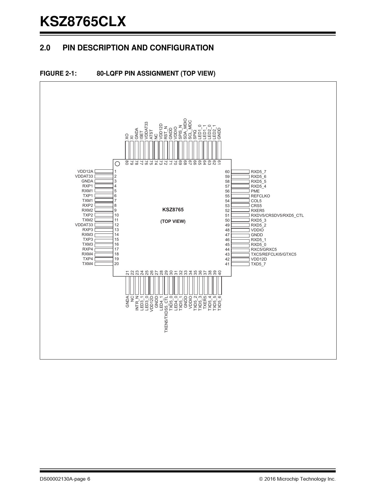 | Páginas / Página | 131 / 6 — KSZ8765CLX. 2.0. PIN DESCRIPTION AND CONFIGURATION. FIGURE 2-1:. 80-LQFP … |