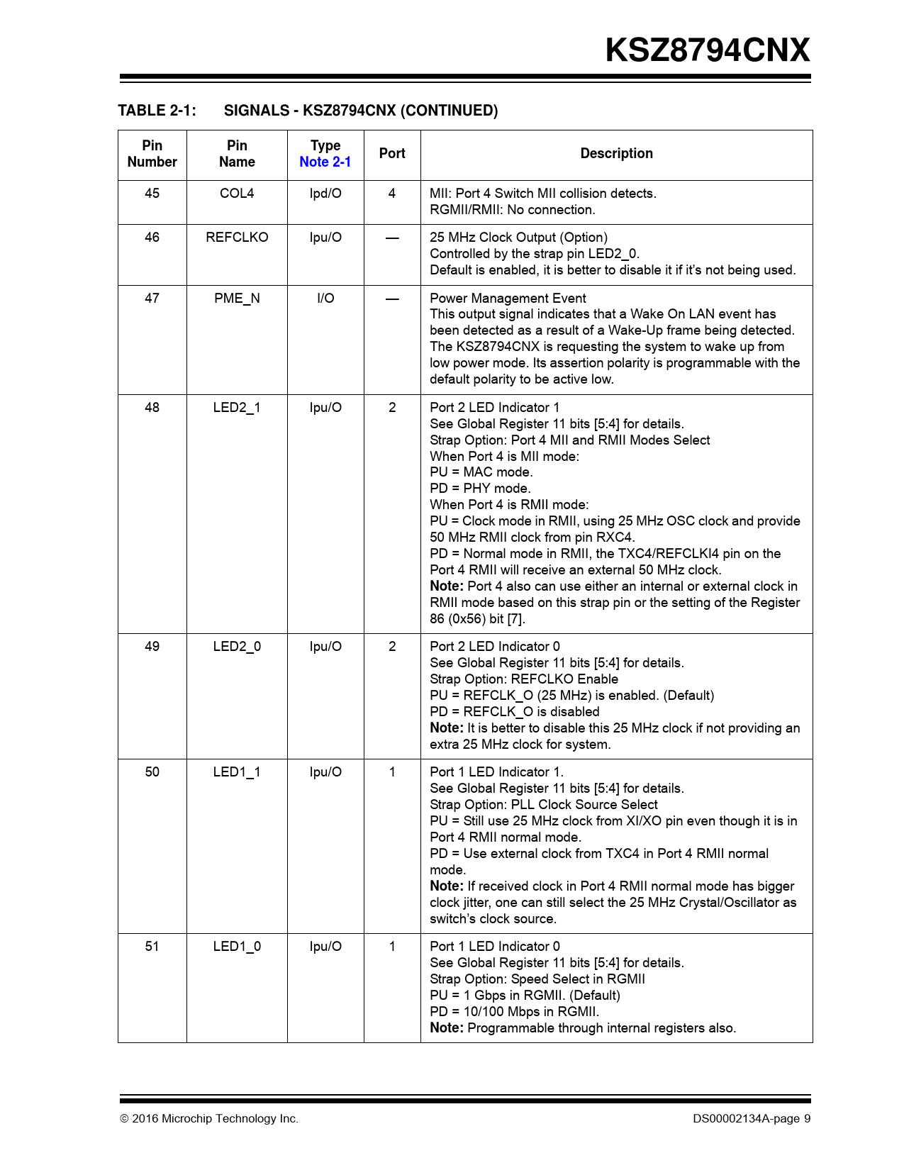 KSZ8794CNXTABLE 2-1:SIGNALS - KSZ8794CNX (CONTINUED)PinPinTypePortDescriptionNumberNameNote 2-1 45 COL4 Ipd/O 4 MII: Port 4 Switch MII col ision detects. RGMII/RMII: No connection. 46 REFCLKO Ipu/O — 25 MHz Clock Output (Option) Controlled by the strap pin LED2_0. Default is enabled, it is better to disable it if it’s not being used. 47 PME_N I/O — Power Management Event This output signal indicates that a Wake On LAN event has been detected as a result of a Wake-Up frame being detected. The KSZ8794CNX is requesting the system to wake up from low power mode. Its assertion polarity is programmable with the default polarity to be active low. 48 LED2_1 Ipu/O 2 Port 2 LED Indicator 1 See Global Register 11 bits [5:4] for details. Strap Option: Port 4 MII and RMII Modes Select When Port 4 is MII mode: PU = MAC mode. PD = PHY mode. When Port 4 is RMII mode: PU = Clock mode in RMII, using 25 MHz OSC clock and provide 50 MHz RMII clock from pin RXC4. PD = Normal mode in RMII, the TXC4/REFCLKI4 pin on the Port 4 RMII will receive an external 50 MHz clock. Note: Port 4 also can use either an internal or external clock in RMII mode based on this strap pin or the setting of the Register 86 (0x56) bit [7]. 49 LED2_0 Ipu/O 2 Port 2 LED Indicator 0 See Global Register 11 bits [5:4] for details. Strap Option: REFCLKO Enable PU = REFCLK_O (25 MHz) is enabled. (Default) PD = REFCLK_O is disabled Note: It is better to disable this 25 MHz clock if not providing an extra 25 MHz clock for system. 50 LED1_1 Ipu/O 1 Port 1 LED Indicator 1. See Global Register 11 bits [5:4] for details. Strap Option: PLL Clock Source Select PU = Still use 25 MHz clock from XI/XO pin even though it is in Port 4 RMII normal mode. PD = Use external clock from TXC4 in Port 4 RMII normal mode. Note: If received clock in Port 4 RMII normal mode has bigger clock jitter, one can still select the 25 MHz Crystal/Oscillator as switch’s clock source. 51 LED1_0 Ipu/O 1 Port 1 LED Indicator 0 See Global Register 11 bits [5:4] for details. Strap Option: Speed Select in RGMII PU = 1 Gbps in RGMII. (Default) PD = 10/100 Mbps in RGMII. Note: Programmable through internal registers also. 2016 Microchip Technology Inc. DS00002134A-page 9 Document Outline 1.0 Introduction 1.1 General Description 2.0 Pin Description and Configuration 3.0 Functional Description 3.1 Physical Layer (PHY) 3.2 Media Access Controller (MAC) Operation 3.3 Switch Core 3.4 Power and Power Management 3.5 Interfaces 3.6 Advanced Functionality 4.0 Device Registers 4.1 Register Map 4.2 Port Registers 4.3 Advanced Control Registers 4.4 Static MAC Address Table 4.5 VLAN Table 4.6 Dynamic MAC Address Table 4.7 PME Indirect Registers 4.8 ACL Rule Table and ACL Indirect Registers 4.9 EEE Indirect Registers 4.10 Management Information Base (MIB) Counters 4.11 MIIM Registers 5.0 Operational Characteristics 5.1 Absolute Maximum Ratings* 5.2 Operating Ratings** 6.0 Electrical Characteristics 7.0 Timing Diagrams 8.0 Reset Circuit 9.0 Selection of Isolation Transformer 10.0 Selection of Reference Crystal 11.0 Package Outlines