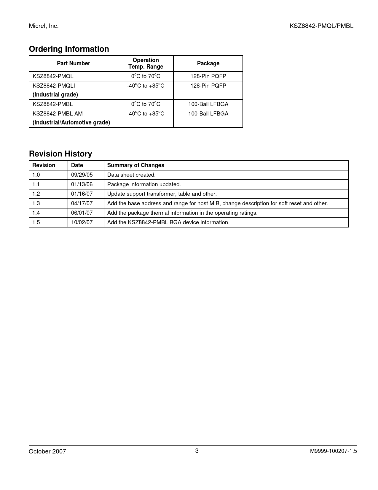 Revision Date Summary of Changes 1.0 09/29/05 Data sheet created. 1.1 01/13/06 Package information updated. 1.2 01/16/07 Update support transformer, table and other. 1.3 04/17/07 Add the base address and range for host MIB, change description for soft reset and other. 1.4 06/01/07 Add the package thermal information in the operating ratings. 1.5 10/02/07 Add the KSZ8842-PMBL BGA device information. October 2007 3 M9999-100207-1.5