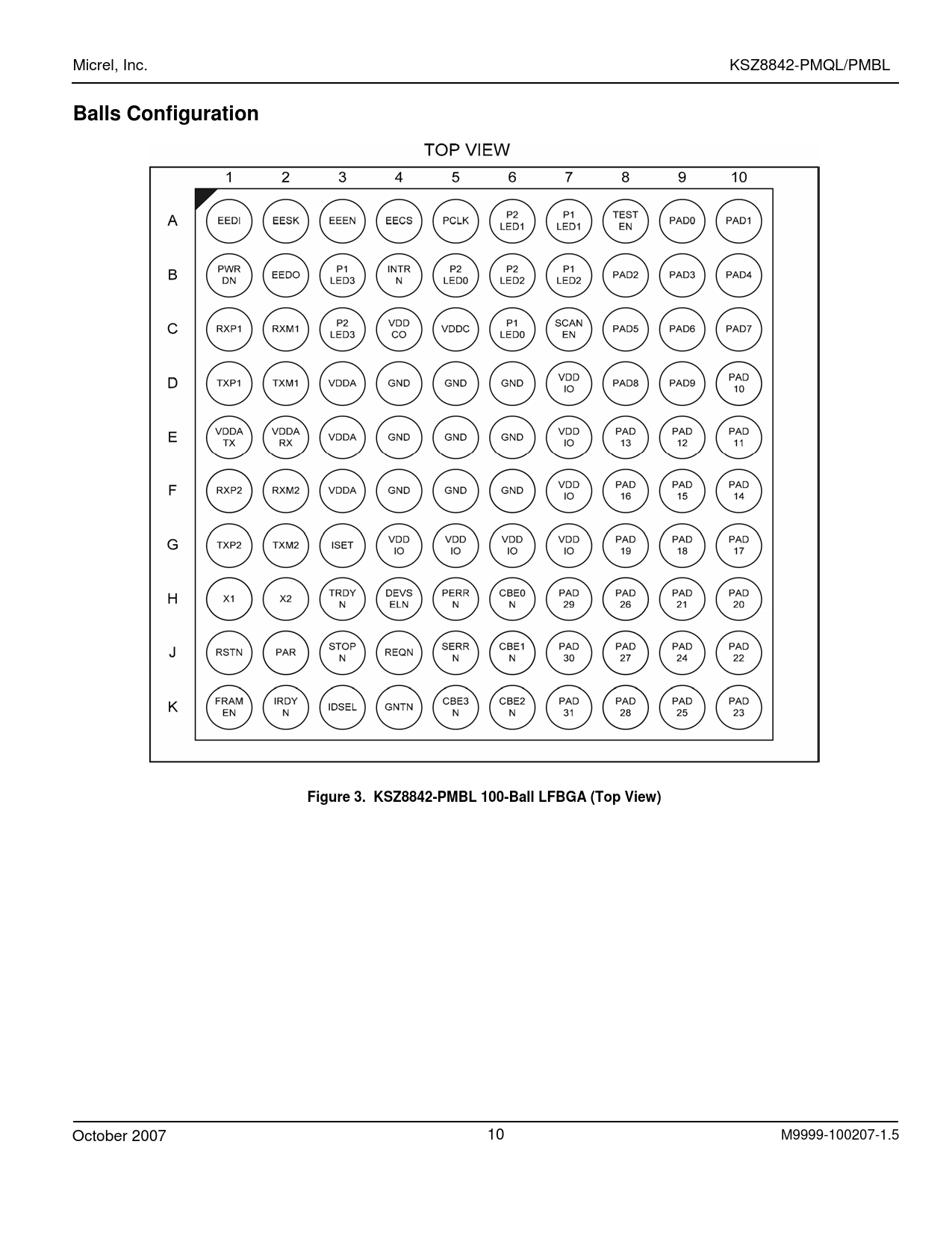 Micrel, Inc. KSZ8842-PMQL/PMBL Balls Configuration Figure 3. KSZ8842-PMBL 100-Ball LFBGA (Top View) October 2007 10 M9999-100207-1.5