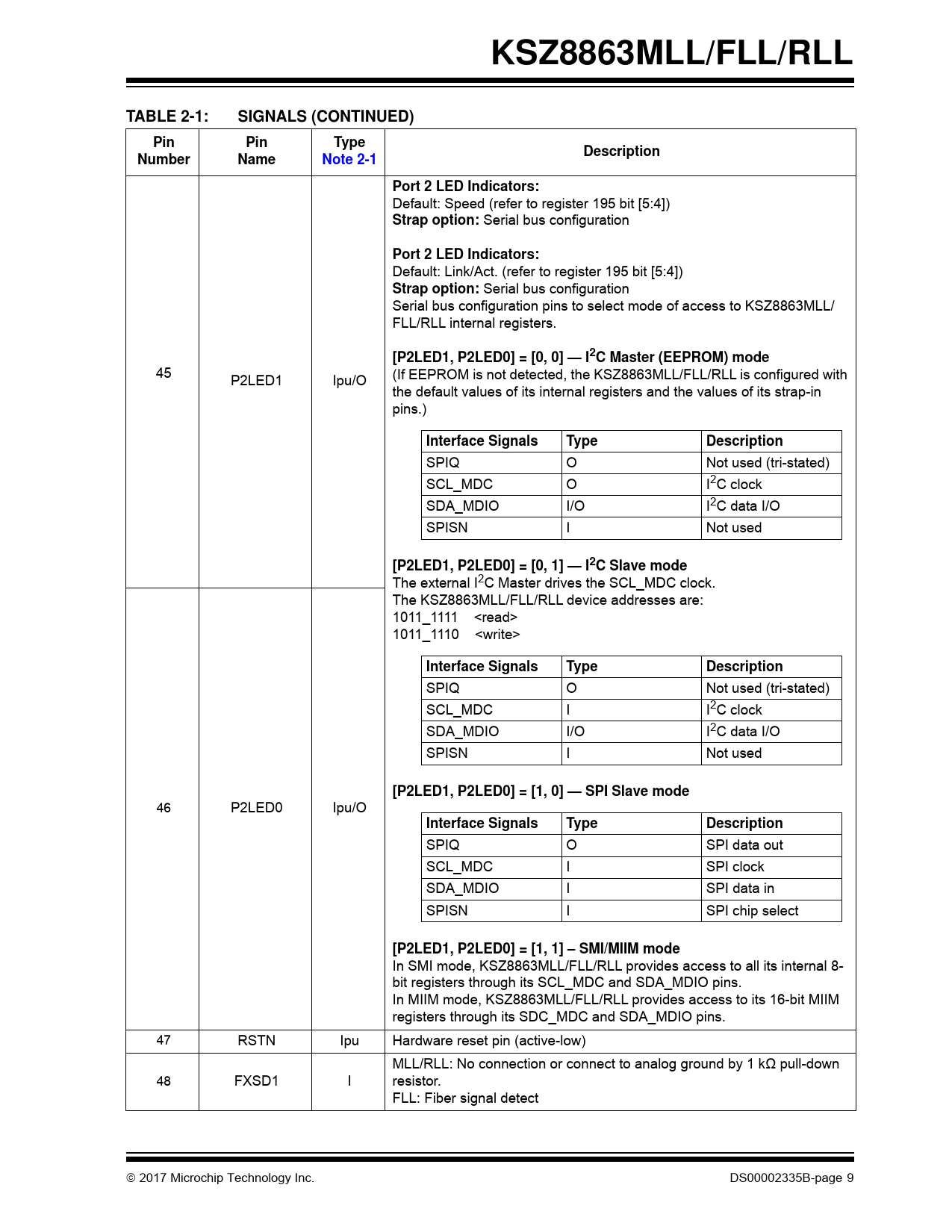 KSZ8863MLL/FLL/RLLTABLE 2-1:SIGNALS (CONTINUED)PinPinTypeDescriptionNumberNameNote 2-1Port 2 LED Indicators: Default: Speed (refer to register 195 bit [5:4]) Strap option: Serial bus configuration Port 2 LED Indicators: Default: Link/Act. (refer to register 195 bit [5:4]) Strap option: Serial bus configuration Serial bus configuration pins to select mode of access to KSZ8863MLL/ FLL/RLL internal registers. [P2LED1, P2LED0] = [0, 0] — I2C Master (EEPROM) mode 45 P2LED1 Ipu/O (If EEPROM is not detected, the KSZ8863MLL/FLL/RLL is configured with the default values of its internal registers and the values of its strap-in pins.) Interface SignalsTypeDescription SPIQ O Not used (tri-stated) SCL_MDC O I2C clock SDA_MDIO I/O I2C data I/O SPISN I Not used [P2LED1, P2LED0] = [0, 1] — I2C Slave mode The external I2C Master drives the SCL_MDC clock. The KSZ8863MLL/FLL/RLL device addresses are: 1011_1111 <read> 1011_1110 <write> Interface SignalsTypeDescription SPIQ O Not used (tri-stated) SCL_MDC I I2C clock SDA_MDIO I/O I2C data I/O SPISN I Not used [P2LED1, P2LED0] = [1, 0] — SPI Slave mode 46 P2LED0 Ipu/O Interface SignalsTypeDescription SPIQ O SPI data out SCL_MDC I SPI clock SDA_MDIO I SPI data in SPISN I SPI chip select [P2LED1, P2LED0] = [1, 1] – SMI/MIIM mode In SMI mode, KSZ8863MLL/FLL/RLL provides access to all its internal 8- bit registers through its SCL_MDC and SDA_MDIO pins. In MIIM mode, KSZ8863MLL/FLL/RLL provides access to its 16-bit MIIM registers through its SDC_MDC and SDA_MDIO pins. 47 RSTN Ipu Hardware reset pin (active-low) MLL/RLL: No connection or connect to analog ground by 1 kΩ pull-down 48 FXSD1 I resistor. FLL: Fiber signal detect 2017 Microchip Technology Inc. DS00002335B-page 9 Document Outline 1.0 Introduction 1.1 General Description 2.0 Pin Description and Configuration 3.0 Functional Description 3.1 Physical Layer Transceiver 3.2 Power Management 3.3 MAC and Switch 3.4 Advanced Switch Functions 3.5 Spanning Tree Support 3.6 Rapid Spanning Tree Support 3.7 Tail Tagging Mode 3.8 IGMP Support 3.9 Port Mirroring Support 3.10 Rate Limiting Support 3.11 Unicast MAC Address Filtering 3.12 Configuration Interface 3.13 Loopback Support 4.0 Register Descriptions 4.1 MII Management (MIIM) Registers 4.2 Register Descriptions 4.3 Memory Map (8-Bit Registers) 4.4 Register Descriptions 4.5 Advanced Control Registers (Registers 96-198) 4.6 Static MAC Address Table 4.7 VLAN Table 4.8 Dynamic MAC Address Table 4.9 Management Information Base (MIB) Counters 5.0 Operational Characteristics 5.1 Absolute Maximum Ratings* 5.2 Operating Ratings** 6.0 Electrical Characteristics 7.0 Timing Specifications 7.1 EEPROM Timing 7.2 MAC Mode MII Timing 7.3 PHY Mode MII Timing 7.4 RMII Timing 7.5 I2C Slave Mode Timing 7.6 SPI Timing 7.7 Auto-Negotiation Timing 7.8 MDC/MDIO Timing 7.9 Reset Timing 8.0 Reset Circuit 9.0 Selection of Isolation Transformers 10.0 Package Outline Appendix A: Data Sheet Revision History Product Identification System Worldwide Sales and Service