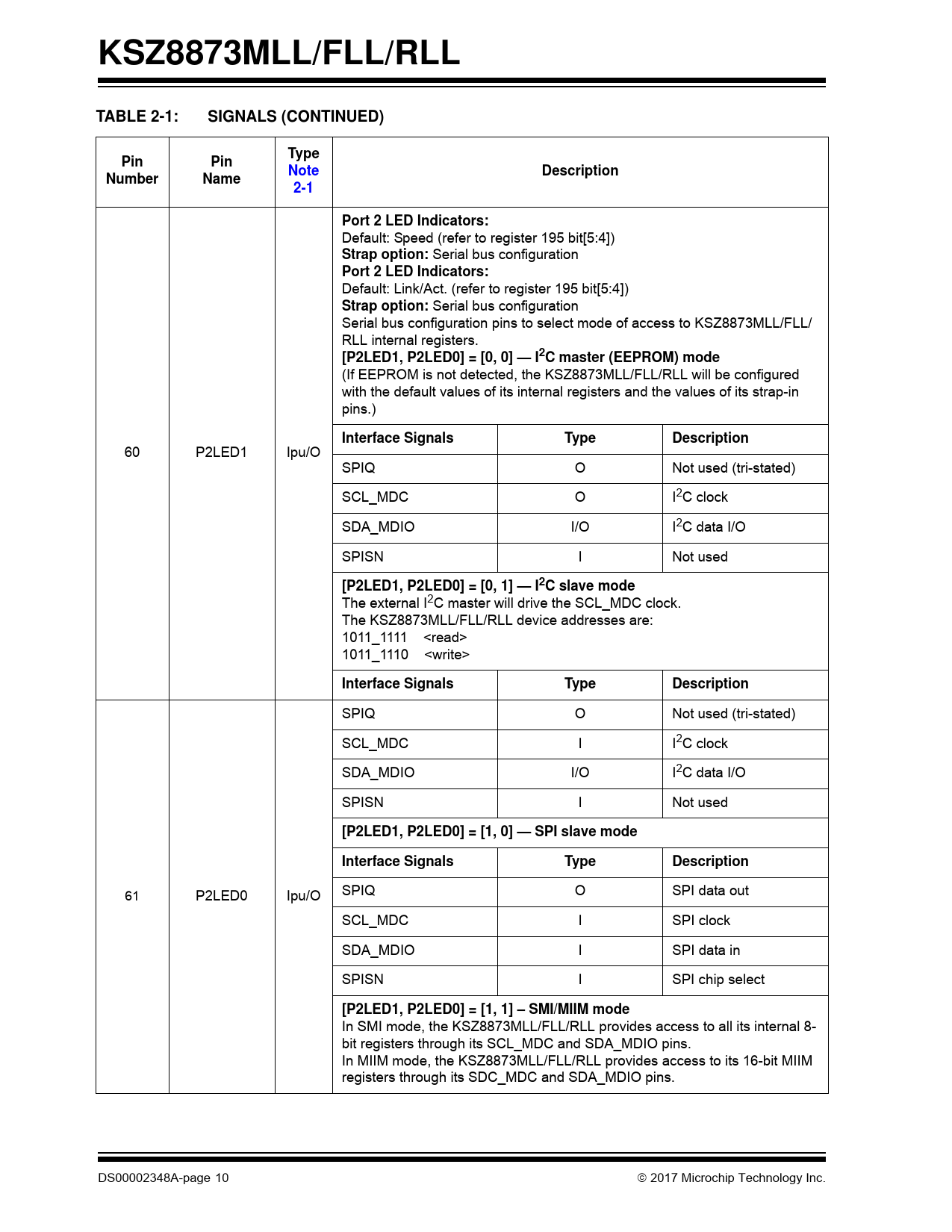 KSZ8873MLL/FLL/RLL. TABLE 2-1:. SIGNALS (CONTINUED). Type. Pin. Note. Description. Number. Name. 2-1. Port 2 LED Indicators:. Strap option: