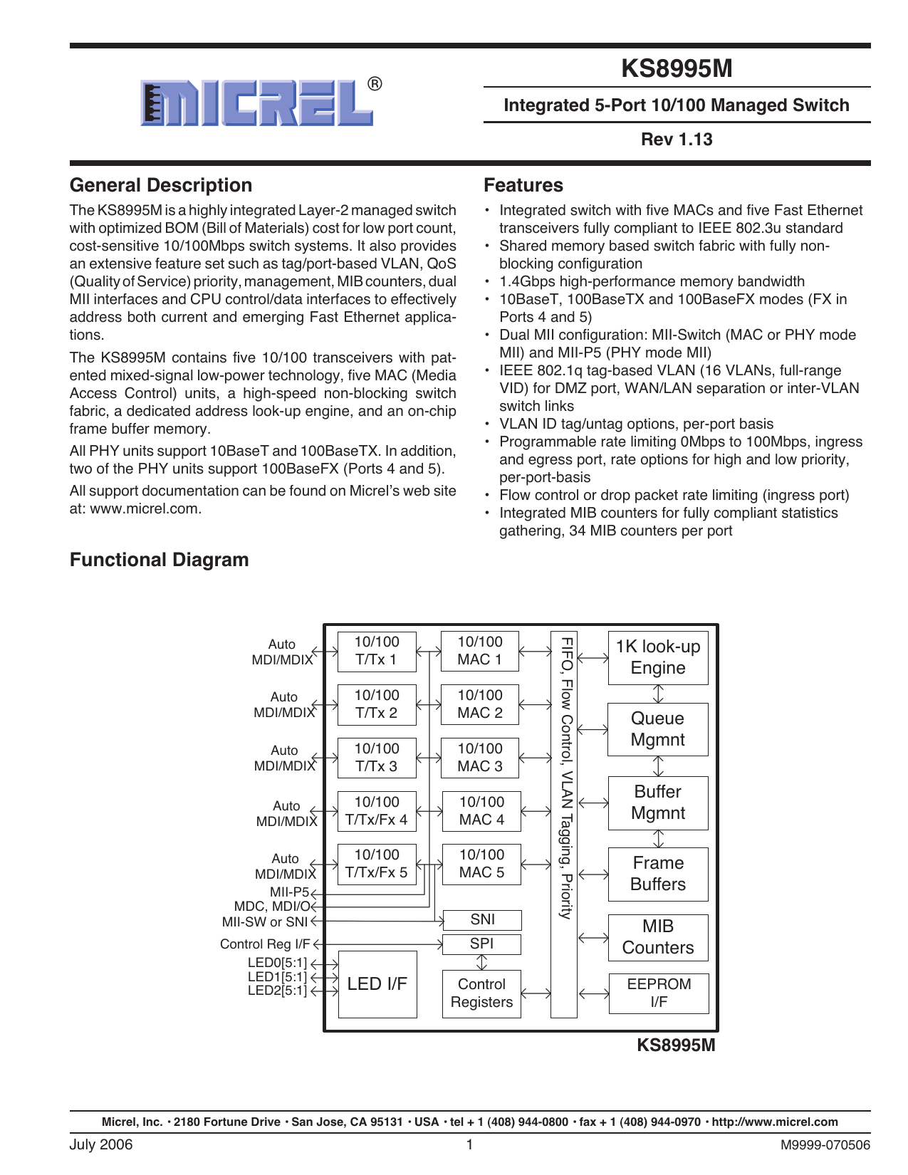 I/F KS8995M Micrel, Inc. • 2180 Fortune Drive • San Jose, CA 95131 • USA • tel + 1 (408) 944-0800 • fax + 1 (408) 944-0970 • http://www.micrel.com July 2006 1 M9999-070506