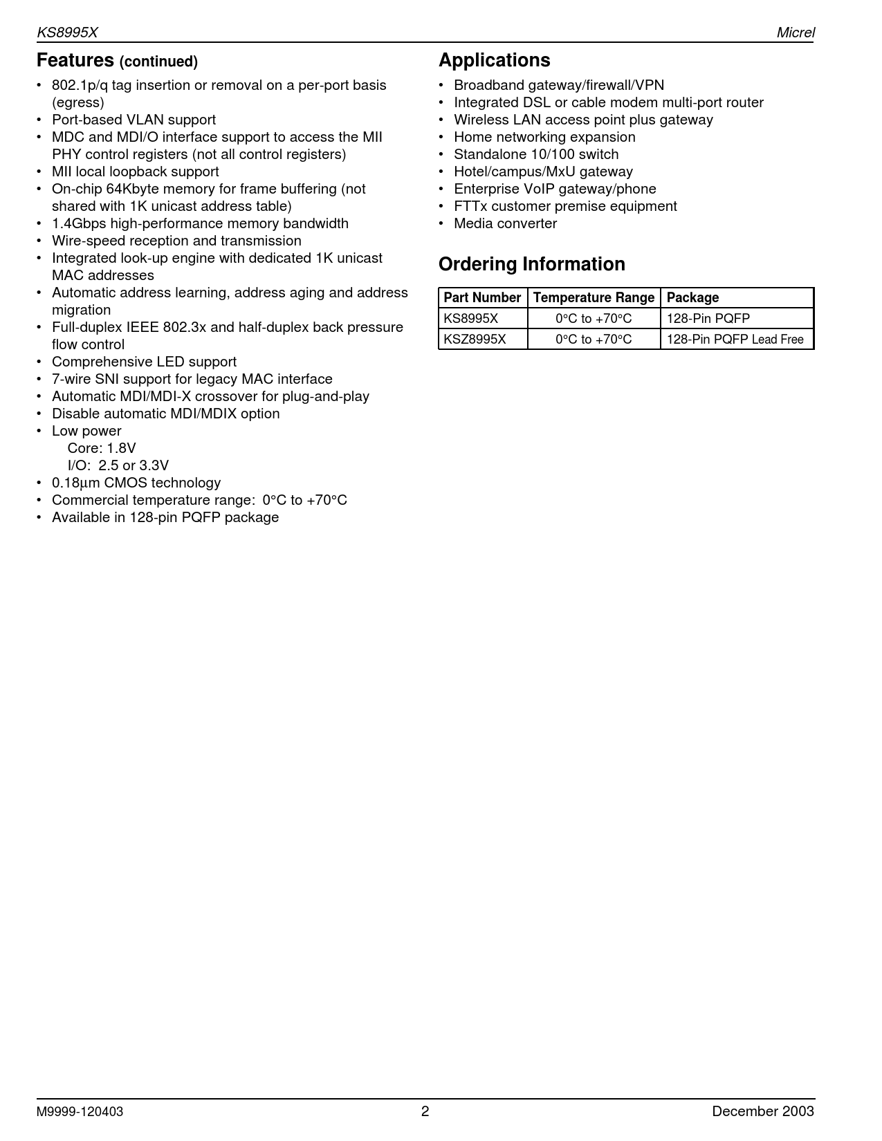 Páginas / Página51 / 2 — KS8995X Micrel Features (continued) Applications • 802.1p/q tag insertion …