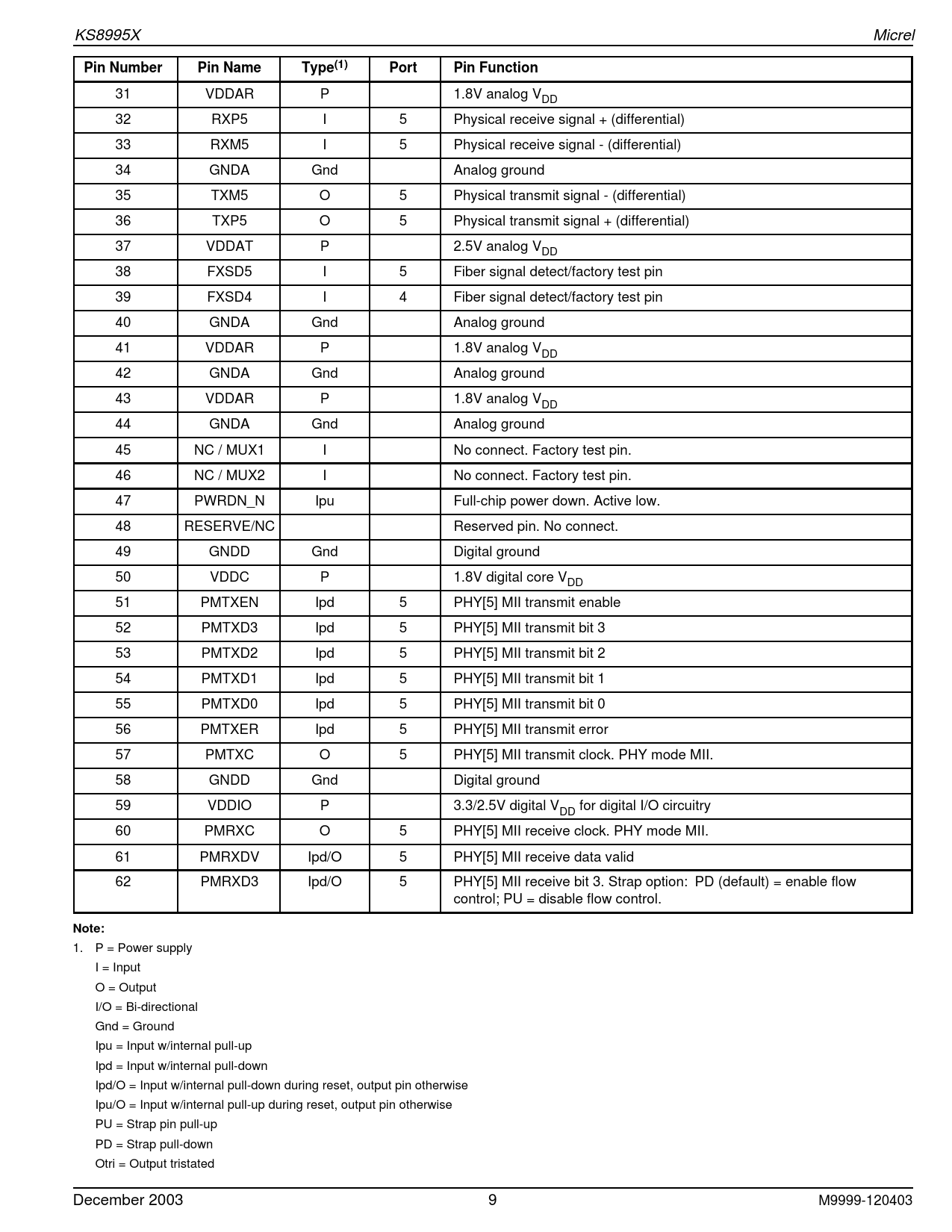 KS8995X Micrel Pin Number Pin Name Type(1) 31 VDDAR P 32 RXP5 I 5 Physical receive signal + (differential) 33 RXM5 I 5 Physical receive signal -(differential) 34 GNDA Gnd 35 TXM5 O 5 Physical transmit signal -(differential) 36 TXP5 O 5 Physical transmit signal + (differential) 37 VDDAT P 38 FXSD5 I 5 Fiber signal detect/factory test pin 39 FXSD4 I 4 Fiber signal detect/factory test pin 40 GNDA Gnd 41 VDDAR P 42 GNDA Gnd 43 VDDAR P 44 GNDA Gnd 45 NC / MUX1 I No connect. Factory test pin. 46 NC / MUX2 I No connect. Factory test pin. 47 PWRDN_N Ipu 48 RESERVE/NC 49 GNDD Gnd 50 VDDC P 51 PMTXEN Ipd 5 PHY[5] MII transmit enable 52 PMTXD3 Ipd 5 PHY[5] MII transmit bit 3 53 PMTXD2 Ipd 5 PHY[5] MII transmit bit 2 54 PMTXD1 Ipd 5 PHY[5] MII transmit bit 1 55 PMTXD0 Ipd 5 PHY[5] MII transmit bit 0 56 PMTXER Ipd 5 PHY[5] MII transmit error 57 PMTXC O 5 PHY[5] MII transmit clock. PHY mode MII. 58 GNDD Gnd 59 VDDIO P 60 PMRXC O 5 PHY[5] MII receive clock. PHY mode MII. 61 PMRXDV Ipd/O 5 PHY[5] MII receive data valid 62 PMRXD3 Ipd/O 5 PHY[5] MII receive bit 3. Strap option: PD (default) = enable flow