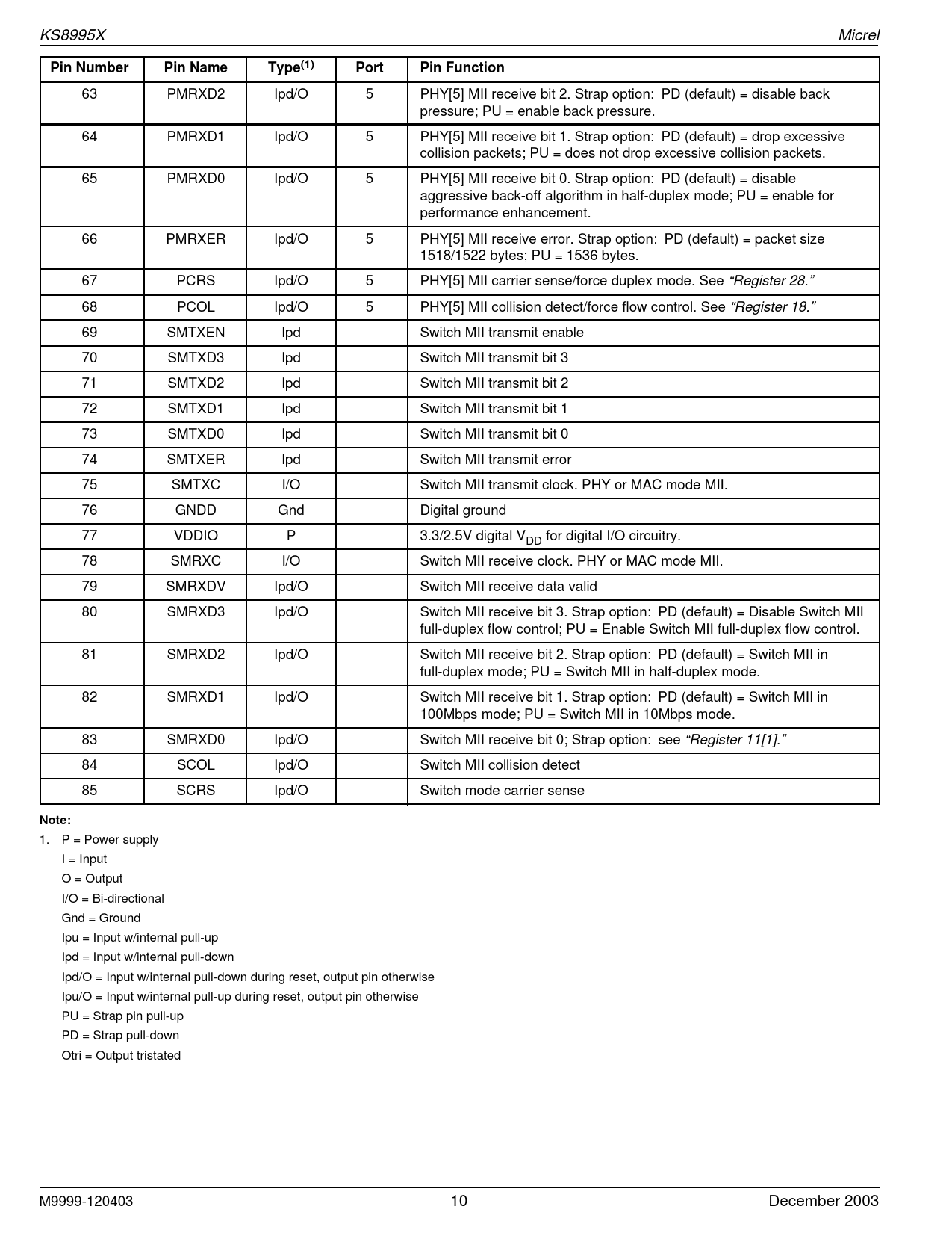 KS8995X Micrel Pin Number Pin Name Type(1) Port 63 PMRXD2 Ipd/O 5 PHY[5] MII receive bit 2. Strap option: PD (default) = disable back