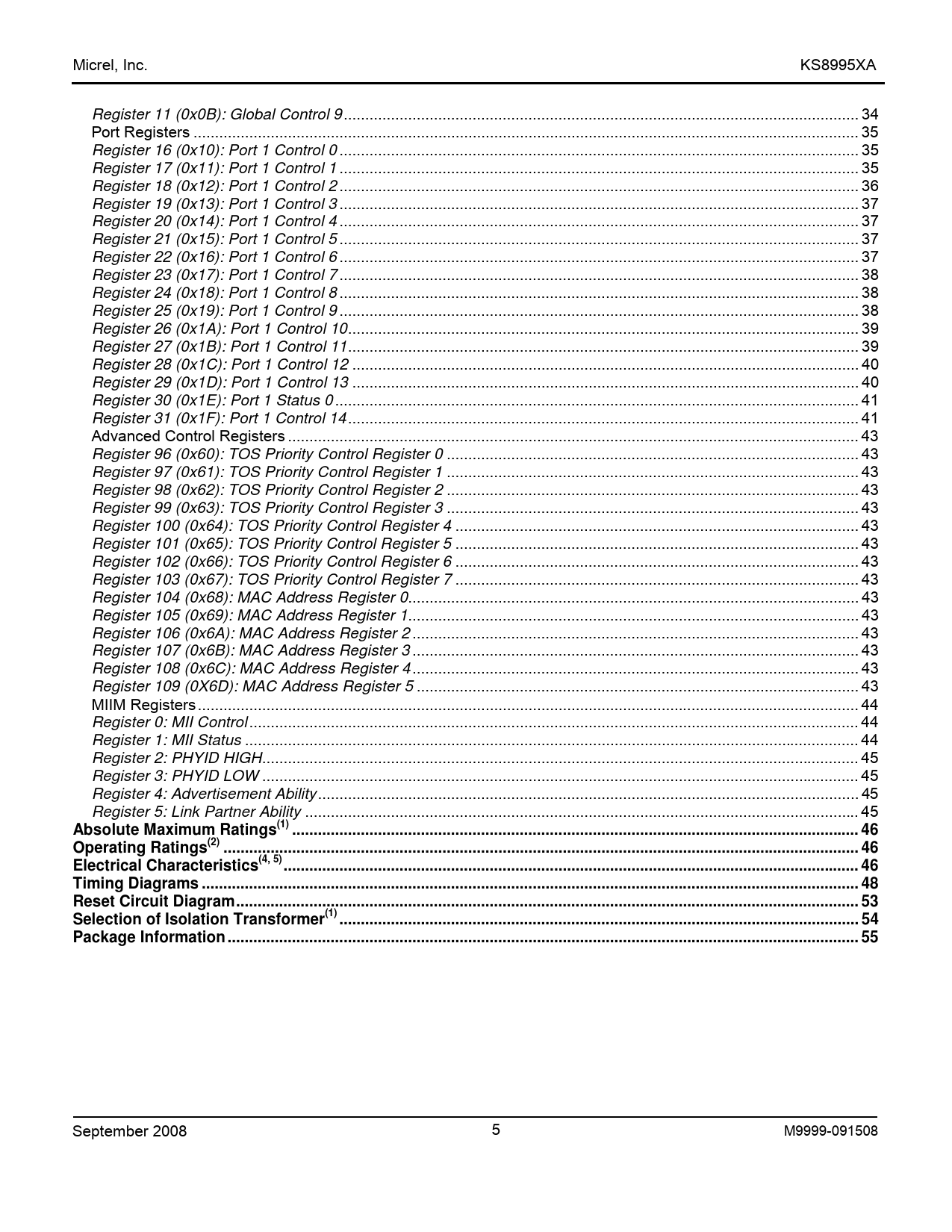| Páginas / Página | 55 / 5 — Micrel, Inc. KS8995XA Register 11 (0x0B): Global Control 9 . 34. Port … |