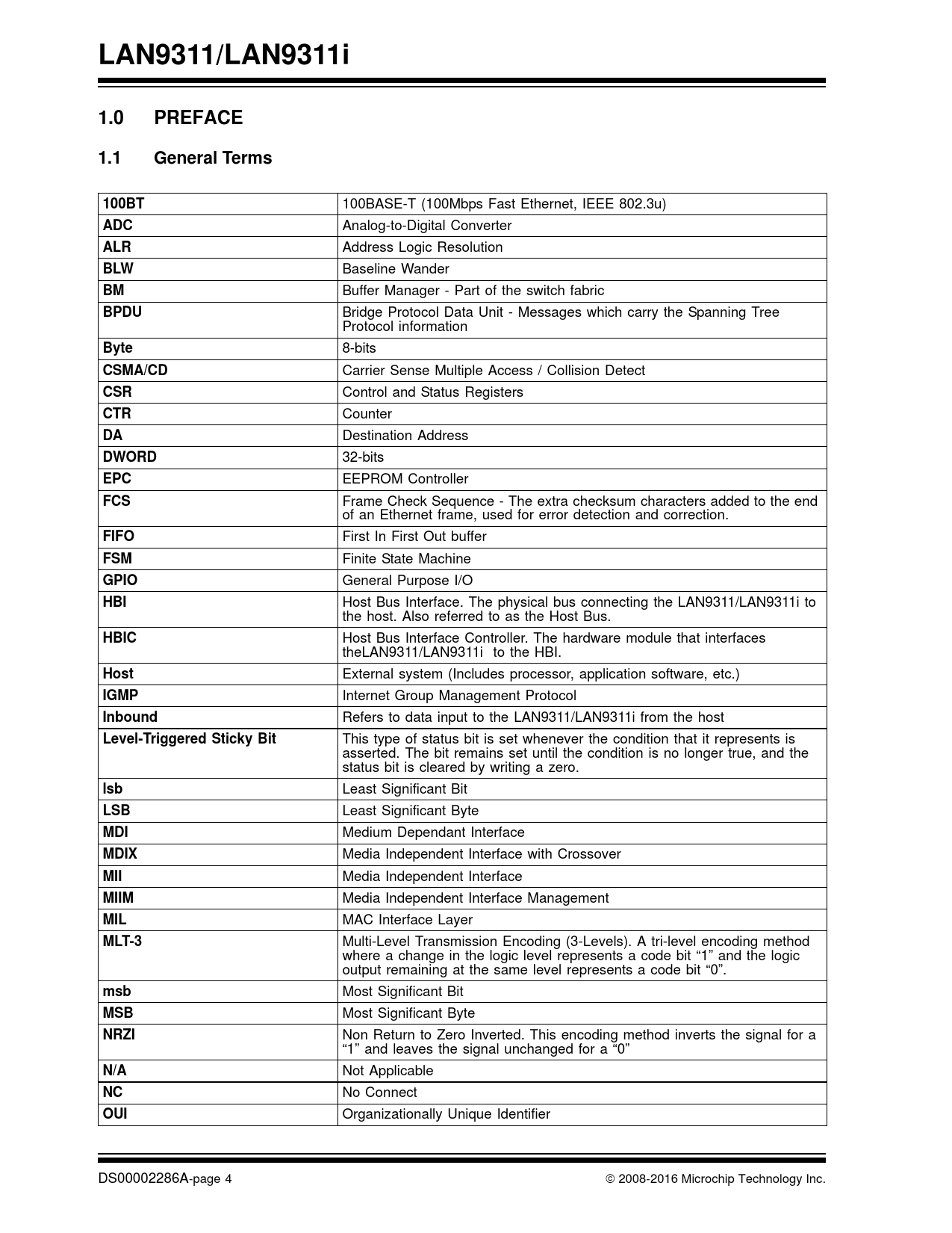 | Páginas / Página | 311 / 4 — LAN9311/LAN9311i. 1.0. PREFACE. 1.1. General Terms. 100BT. ADC. ALR. BLW. … |