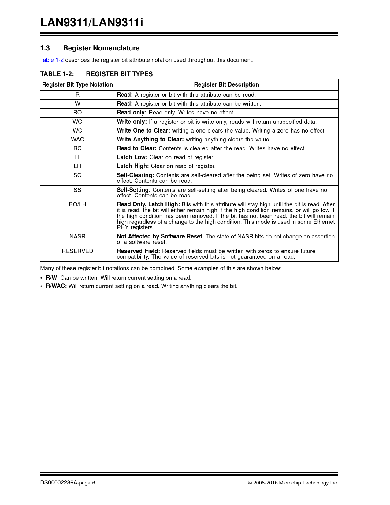 LAN9311/LAN9311i. 1.3. Register Nomenclature. TABLE 1-2:. REGISTER BIT TYPES. Register Bit Type Notation. Register Bit Description