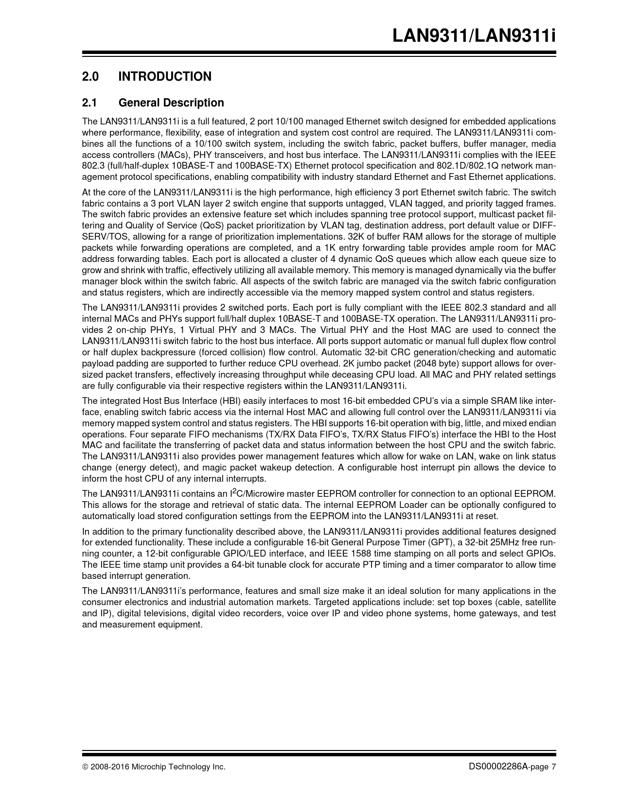 Páginas / Página311 / 7 — LAN9311/LAN9311i. 2.0. INTRODUCTION. 2.1. General Description