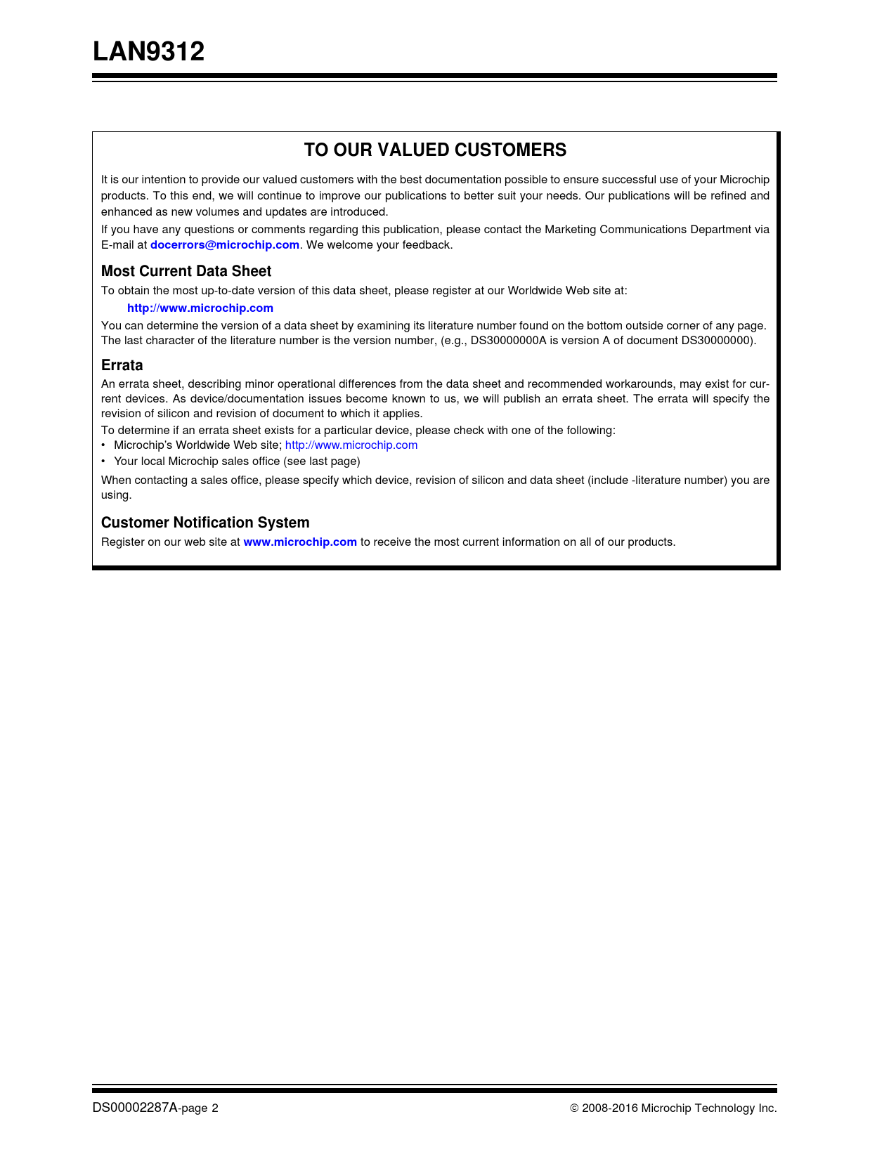 LAN9312TO OUR VALUED CUSTOMERS It is our intention to provide our valued customers with the best documentation possible to ensure successful use of your Microchip products. To this end, we will continue to improve our publications to better suit your needs. Our publications will be refined and enhanced as new volumes and updates are introduced. If you have any questions or comments regarding this publication, please contact the Marketing Communications Department via E-mail at docerrors@microchip.com . We welcome your feedback. Most Current Data Sheet To obtain the most up-to-date version of this data sheet, please register at our Worldwide Web site at: http://www.microchip.com You can determine the version of a data sheet by examining its literature number found on the bottom outside corner of any page. The last character of the literature number is the version number, (e.g., DS30000000A is version A of document DS30000000). Errata An errata sheet, describing minor operational differences from the data sheet and recommended workarounds, may exist for cur- rent devices. As device/documentation issues become known to us, we will publish an errata sheet. The errata will specify the revision of silicon and revision of document to which it applies. To determine if an errata sheet exists for a particular device, please check with one of the following: • Microchip’s Worldwide Web site; http://www.microchip.com • Your local Microchip sales office (see last page) When contacting a sales office, please specify which device, revision of silicon and data sheet (include -literature number) you are using. Customer Notification System Register on our web site at www.microchip.com to receive the most current information on all of our products. DS00002287A-page 2 2008-2016 Microchip Technology Inc. Document Outline 1.0 Preface 1.1 General Terms 1.2 Buffer Types TABLE 1-1: Buffer Types 1.3 Register Nomenclature TABLE 1-2: Register Bit Types 2.0 Introduction 2.1 General Description 2.2 Block Diagram FIGURE 2-1: Internal LAN9312 Block Diagram 2.2.1 System Clocks/Reset/PME Controller 2.2.2 System Interrupt Controller 2.2.3 Switch Fabric 2.2.4 Ethernet PHYs 2.2.5 Host Bus Interface (HBI) 2.2.6 Host MAC 2.2.7 EEPROM Controller/Loader 2.2.8 1588 Time Stamp 2.2.9 GPIO/LED Controller 2.3 System Configuration FIGURE 2-2: System Block Diagram 3.0 Pin Description and Configuration 3.1 Pin Diagrams 3.1.1 128-VTQFP Pin Diagram FIGURE 3-1: LAN9312 128-VTQFP Pin Assignments (TOP VIEW) 3.1.2 128-XVTQFP Pin Diagram FIGURE 3-2: LAN9312 128-XVTQFP Pin Assignments (TOP VIEW) 3.2 Pin Descriptions TABLE 3-1: LAN Port 1 Pins TABLE 3-2: LAN Port 2 Pins TABLE 3-3: LAN Port 1 & 2 Power and Common Pins TABLE 3-4: Host Bus Interface Pins TABLE 3-5: EEPROM Pins TABLE 3-6: Dedicated Configuration Strap Pins TABLE 3-7: Miscellaneous Pins TABLE 3-8: PLL Pins TABLE 3-9: Core and I/O Power and Ground Pins TABLE 3-10: No-Connect Pins 4.0 Clocking, Resets, and Power Management 4.1 Clocks 4.2 Resets TABLE 4-1: Reset Sources and Affected LAN9312 Circuitry 4.2.1 Chip-Level Resets 4.2.2 Multi-Module Resets 4.2.3 Single-Module Resets 4.2.4 Configuration Straps TABLE 4-2: Soft-Strap Configuration Strap Definitions TABLE 4-3: Hard-Strap Configuration Strap Definitions 4.3 Power Management FIGURE 4-1: PME and PME_INT Signal Generation 4.3.1 Port 1 & 2 PHY Power Management 4.3.2 Host MAC Power Management 5.0 System Interrupts 5.1 Functional Overview 5.2 Interrupt Sources FIGURE 5-1: Functional Interrupt Register Hierarchy 5.2.1 1588 Time Stamp Interrupts 5.2.2 Switch Fabric Interrupts 5.2.3 Ethernet PHY Interrupts 5.2.4 GPIO Interrupts 5.2.5 Host MAC Interrupts 5.2.6 Power Management Interrupts 5.2.7 General Purpose Timer Interrupt 5.2.8 Software Interrupt 5.2.9 Device Ready Interrupt 6.0 Switch Fabric 6.1 Functional Overview 6.2 Switch Fabric CSRs 6.2.1 Switch Fabric CSR Writes FIGURE 6-1: Switch Fabric CSR Write Access Flow Diagram 6.2.2 Switch Fabric CSR Reads FIGURE 6-2: Switch Fabric CSR Read Access Flow Diagram 6.2.3 Flow Control Enable Logic TABLE 6-1: Switch Fabric Flow Control Enable Logic 6.3 10/100 Ethernet MACs 6.3.1 Receive MAC 6.3.2 Transmit MAC 6.4 Switch Engine (SWE) 6.4.1 MAC Address Lookup Table FIGURE 6-3: ALR Table Entry Structure 6.4.2 Forwarding Rules 6.4.3 Transmit Priority Queue Selection FIGURE 6-4: Switch Engine Transmit Queue Selection FIGURE 6-5: Switch Engine Transmit Queue Calculation 6.4.4 VLAN Support TABLE 6-2: VLAN Table Entry Structure 6.4.5 Spanning Tree Support TABLE 6-3: Spanning Tree States 6.4.6 Ingress Flow Metering and Coloring TABLE 6-4: Typical Ingress Rate Settings FIGURE 6-6: Switch Engine Ingress Flow Priority Selection FIGURE 6-7: Switch Engine Ingress Flow Priority Calculation 6.4.7 Broadcast Storm Control TABLE 6-5: Typical Broadcast Rate Settings 6.4.8 IPv4 IGMP Support 6.4.9 Port Mirroring 6.4.10 Host CPU Port Special Tagging 6.4.11 Counters 6.5 Buffer Manager (BM) 6.5.1 Packet Buffer Allocation 6.5.2 Random Early Discard (RED) 6.5.3 Transmit Queues 6.5.4 Transmit Priority Queue Servicing 6.5.5 Egress Rate Limiting (Leaky Bucket) TABLE 6-6: Typical Egress Rate Settings 6.5.6 Adding, Removing, and Changing VLAN Tags FIGURE 6-8: Hybrid Port Tagging and Un-tagging 6.5.7 Counters 6.6 Switch Fabric Interrupts 7.0 Ethernet PHYs 7.1 Functional Overview 7.1.1 PHY Addressing TABLE 7-1: Default PHY Serial MII Addressing 7.2 Port 1 & 2 PHYs FIGURE 7-1: Port x PHY Block Diagram 7.2.1 100BASE-TX Transmit FIGURE 7-2: 100BASE-TX Transmit Data Path TABLE 7-2: 4B/5B Code Table 7.2.2 100BASE-TX Receive FIGURE 7-3: 100BASE-TX Receive Data Path 7.2.3 10BASE-T Transmit 7.2.4 10BASE-T Receive 7.2.5 PHY Auto-negotiation 7.2.6 HP Auto-MDIX FIGURE 7-4: Direct Cable Connection vs. Cross-Over Cable Connection 7.2.7 MII MAC Interface 7.2.8 PHY Management Control TABLE 7-3: PHY Interrupt Sources 7.2.9 PHY Power-Down Modes 7.2.10 PHY Resets 7.2.11 LEDs 7.2.12 Required Ethernet Magnetics 7.3 Virtual PHY 7.3.1 Virtual PHY 