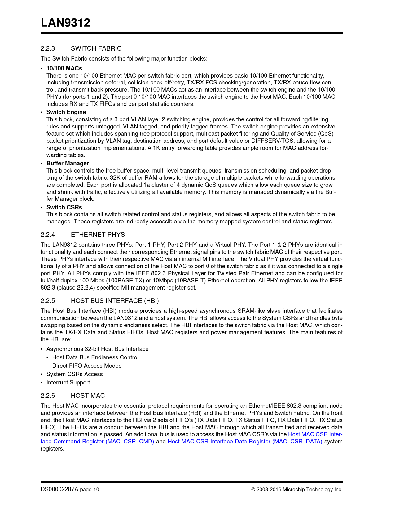 link to page 150 link to page 150 link to page 150 LAN9312 2.2.3 SWITCH FABRIC The Switch Fabric consists of the following major function blocks: • 10/100 MACs There is one 10/100 Ethernet MAC per switch fabric port, which provides basic 10/100 Ethernet functionality, including transmission deferral, collision back-off/retry, TX/RX FCS checking/generation, TX/RX pause flow con- trol, and transmit back pressure. The 10/100 MACs act as an interface between the switch engine and the 10/100 PHYs (for ports 1 and 2). The port 0 10/100 MAC interfaces the switch engine to the Host MAC. Each 10/100 MAC includes RX and TX FIFOs and per port statistic counters. • Switch Engine This block, consisting of a 3 port VLAN layer 2 switching engine, provides the control for all forwarding/filtering rules and supports untagged, VLAN tagged, and priority tagged frames. The switch engine provides an extensive feature set which includes spanning tree protocol support, multicast packet filtering and Quality of Service (QoS) packet prioritization by VLAN tag, destination address, and port default value or DIFFSERV/TOS, allowing for a range of prioritization implementations. A 1K entry forwarding table provides ample room for MAC address for- warding tables. • Buffer Manager This block controls the free buffer space, multi-level transmit queues, transmission scheduling, and packet drop- ping of the switch fabric. 32K of buffer RAM allows for the storage of multiple packets while forwarding operations are completed. Each port is allocated 1a cluster of 4 dynamic QoS queues which allow each queue size to grow and shrink with traffic, effectively utilizing all available memory. This memory is managed dynamically via the Buf- fer Manager block. • Switch CSRs This block contains all switch related control and status registers, and allows all aspects of the switch fabric to be managed. These registers are indirectly accessible via the memory mapped system control and status registers 2.2.4 ETHERNET PHYS The LAN9312 contains three PHYs: Port 1 PHY, Port 2 PHY and a Virtual PHY. The Port 1 & 2 PHYs are identical in functionality and each connect their corresponding Ethernet signal pins to the switch fabric MAC of their respective port. These PHYs interface with their respective MAC via an internal MII interface. The Virtual PHY provides the virtual func- tionality of a PHY and allows connection of the Host MAC to port 0 of the switch fabric as if it was connected to a single port PHY. All PHYs comply with the IEEE 802.3 Physical Layer for Twisted Pair Ethernet and can be configured for full/half duplex 100 Mbps (100BASE-TX) or 10Mbps (10BASE-T) Ethernet operation. All PHY registers follow the IEEE 802.3 (clause 22.2.4) specified MII management register set. 2.2.5 HOST BUS INTERFACE (HBI) The Host Bus Interface (HBI) module provides a high-speed asynchronous SRAM-like slave interface that facilitates communication between the LAN9312 and a host system. The HBI allows access to the System CSRs and handles byte swapping based on the dynamic endianess select. The HBI interfaces to the switch fabric via the Host MAC, which con- tains the TX/RX Data and Status FIFOs, Host MAC registers and power management features. The main features of the HBI are: • Asynchronous 32-bit Host Bus Interface - Host Data Bus Endianess Control - Direct FIFO Access Modes • System CSRs Access • Interrupt Support 2.2.6 HOST MAC The Host MAC incorporates the essential protocol requirements for operating an Ethernet/IEEE 802.3-compliant node and provides an interface between the Host Bus Interface (HBI) and the Ethernet PHYs and Switch Fabric. On the front end, the Host MAC interfaces to the HBI via 2 sets of FIFO’s (TX Data FIFO, TX Status FIFO, RX Data FIFO, RX Status FIFO). The FIFOs are a conduit between the HBI and the Host MAC through which all transmitted and received data and status information is passed. An additional bus is used to access the Host MAC CSR’s via the Host MAC CSR Inter- face Command Register (MAC_CSR_CMD) and Host MAC CSR Interface Data Register (MAC_CSR_DATA) system registers. DS00002287A-page 10 2008-2016 Microchip Technology Inc. Document Outline 1.0 Preface 1.1 General Terms 1.2 Buffer Types TABLE 1-1: Buffer Types 1.3 Register Nomenclature TABLE 1-2: Register Bit Types 2.0 Introduction 2.1 General Description 2.2 Block Diagram FIGURE 2-1: Internal LAN9312 Block Diagram 2.2.1 System Clocks/Reset/PME Controller 2.2.2 System Interrupt Controller 2.2.3 Switch Fabric 2.2.4 Ethernet PHYs 2.2.5 Host Bus Interface (HBI) 2.2.6 Host MAC 2.2.7 EEPROM Controller/Loader 2.2.8 1588 Time Stamp 2.2.9 GPIO/LED Controller 2.3 System Configuration FIGURE 2-2: System Block Diagram 3.0 Pin Description and Configuration 3.1 Pin Diagrams 3.1.1 128-VTQFP Pin Diagram FIGURE 3-1: LAN9312 128-VTQFP Pin Assignments (TOP VIEW) 3.1.2 128-XVTQFP Pin Diagram FIGURE 3-2: LAN9312 128-XVTQFP Pin Assignments (TOP VIEW) 3.2 Pin Descriptions TABLE 3-1: LAN Port 1 Pins TABLE 3-2: LAN Port 2 Pins TABLE 3-3: LAN Port 1 & 2 Power and Common Pins TABLE 3-4: Host Bus Interface Pins TABLE 3-5: EEPROM Pins TABLE 3-6: Dedicated Configuration Strap Pins TABLE 3-7: Miscellaneous Pins TABLE 3-8: PLL Pins TABLE 3-9: Core and I/O Power and Ground Pins TABLE 3-10: No-Connect Pins 4.0 Clocking, Resets, and Power Management 4.1 Clocks 4.2 Resets TABLE 4-1: Reset Sources and Affected LAN9312 Circuitry 4.2.1 Chip-Level Resets 4.2.2 Multi-Module Resets 4.2.3 Single-Module Resets 4.2.4 Configuration Straps TABLE 4-2: Soft-Strap Configuration Strap Definitions TABLE 4-3: Hard-Strap Configuration Strap Definitions 4.3 Power Management FIGURE 4-1: PME and PME_INT Signal Generation 4.3.1 Port 1 & 2 PHY Power Management 4.3.2 Host MAC Power Management 5.0 System Interrupts 5.1 Functional Overview 5.2 Interrupt Sources FIGURE 5-1: Functional Interrupt Register Hierarchy 5.2.1 1588 Time Stamp Interrupts 5.2.2 Switch Fabric Interrupts 5.2.3 Ethernet PHY Interrupts 5.2.4
