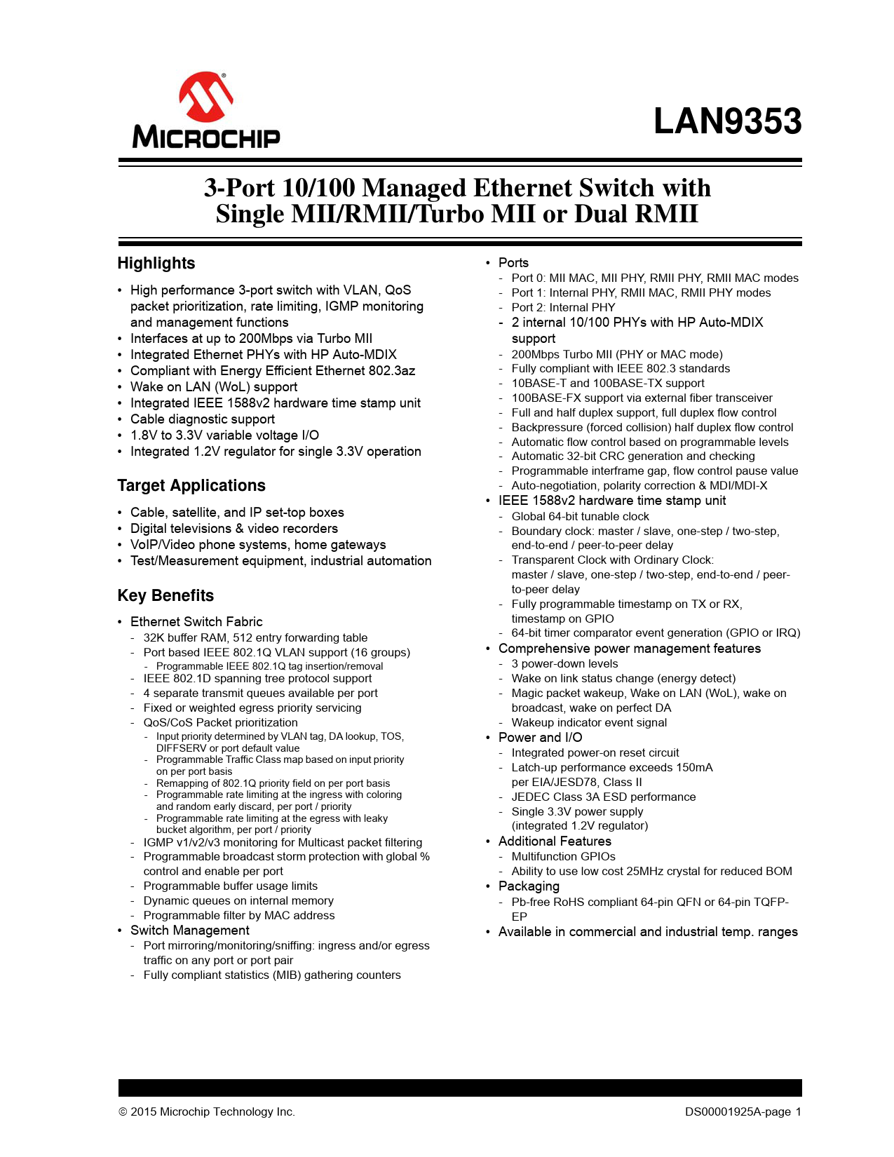 LAN9353. 3-Port 10/100 Managed Ethernet Switch with. Single MII/RMII/Turbo MII or Dual RMII. Highlights. Target Applications