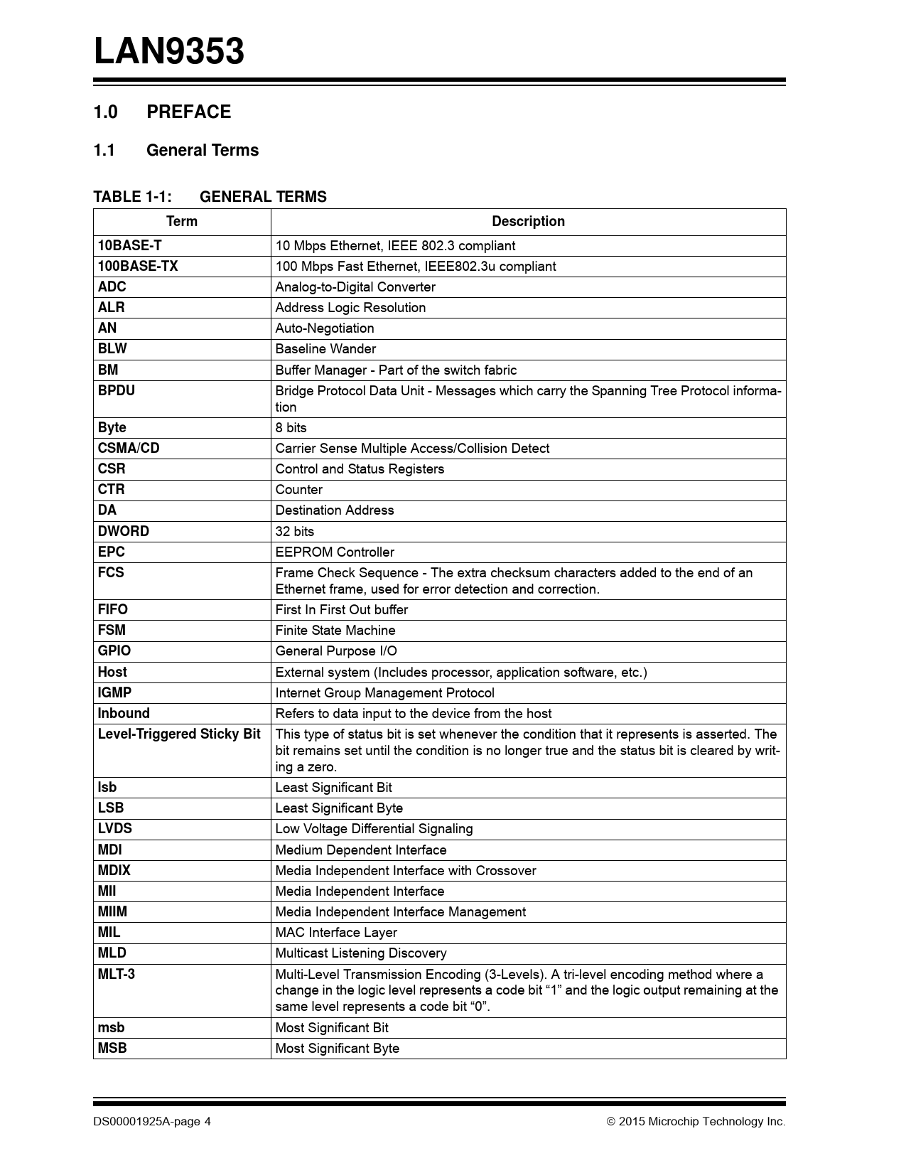 LAN9353. 1.0. PREFACE. 1.1. General Terms. TABLE 1-1:. GENERAL TERMS. Term. Description. 10BASE-T. 100BASE-TX. ADC. ALR. BLW. BPDU. Byte. CSMA/CD. CSR. CTR